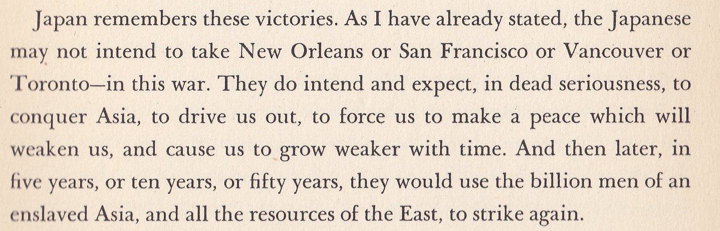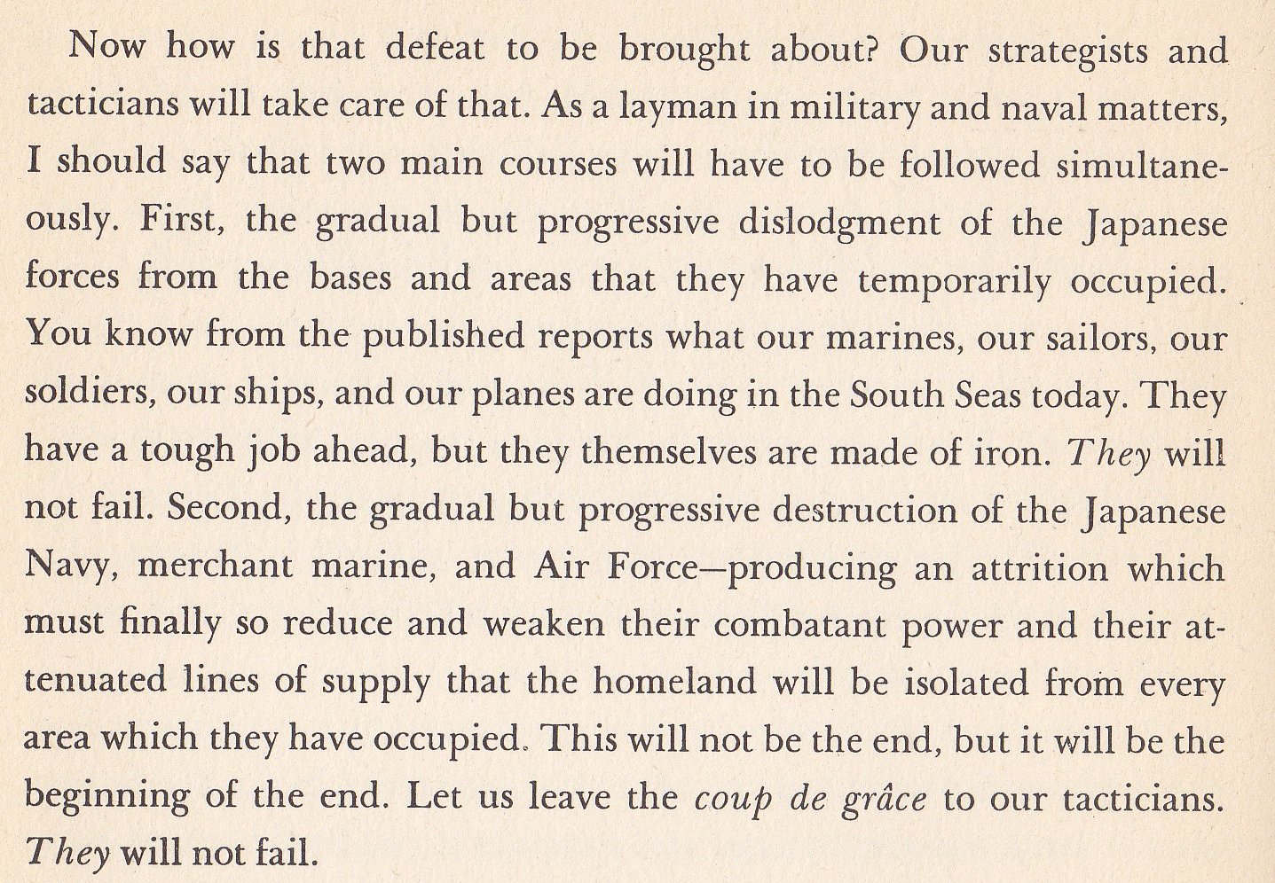He talks about the things needed to defeat Japan and mentions the merchant marine, which is something often not covered in books on the war. The destruction of Japan's ability to export and import materials was critically important to the process of weakening Japan.