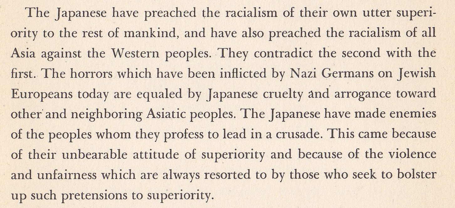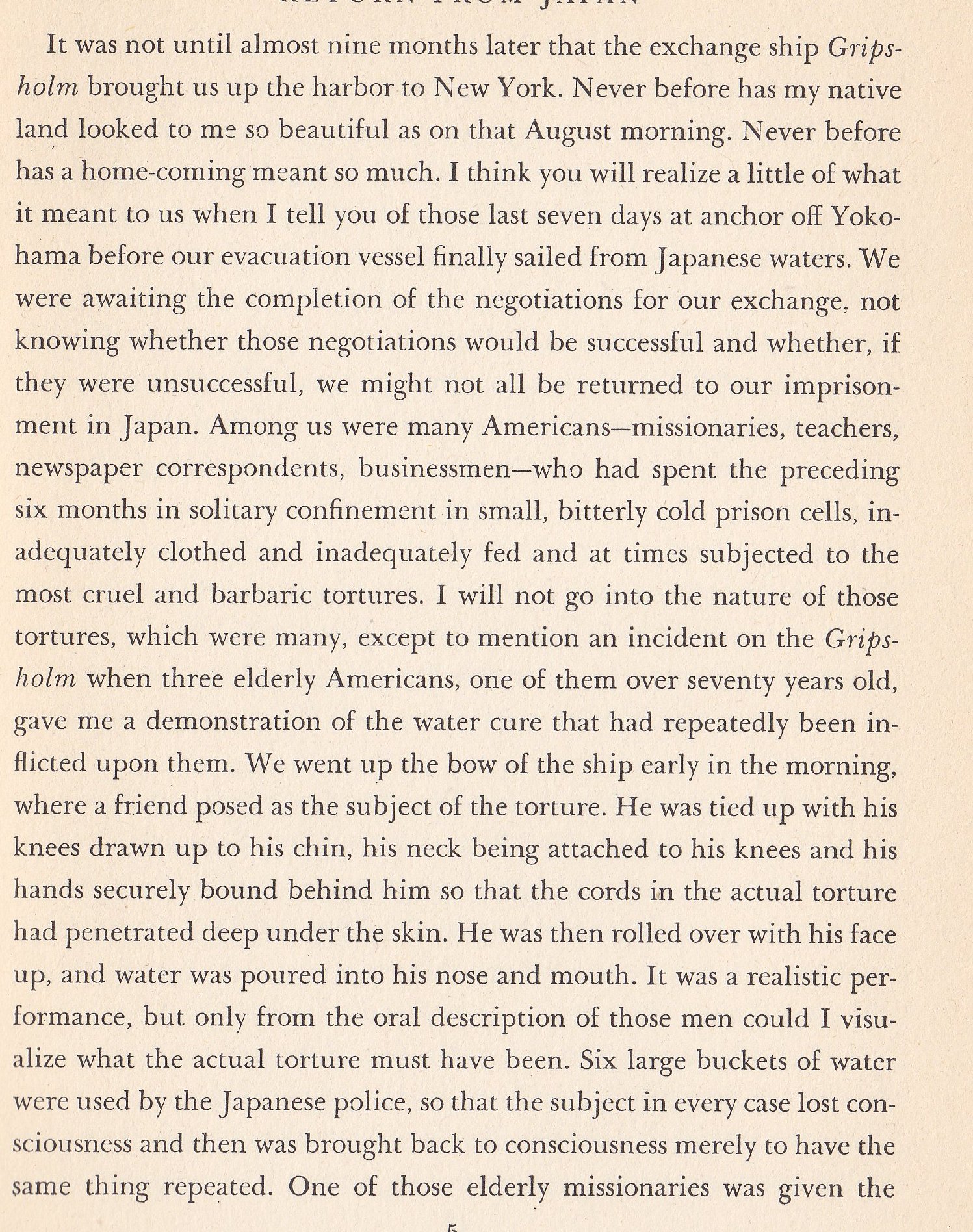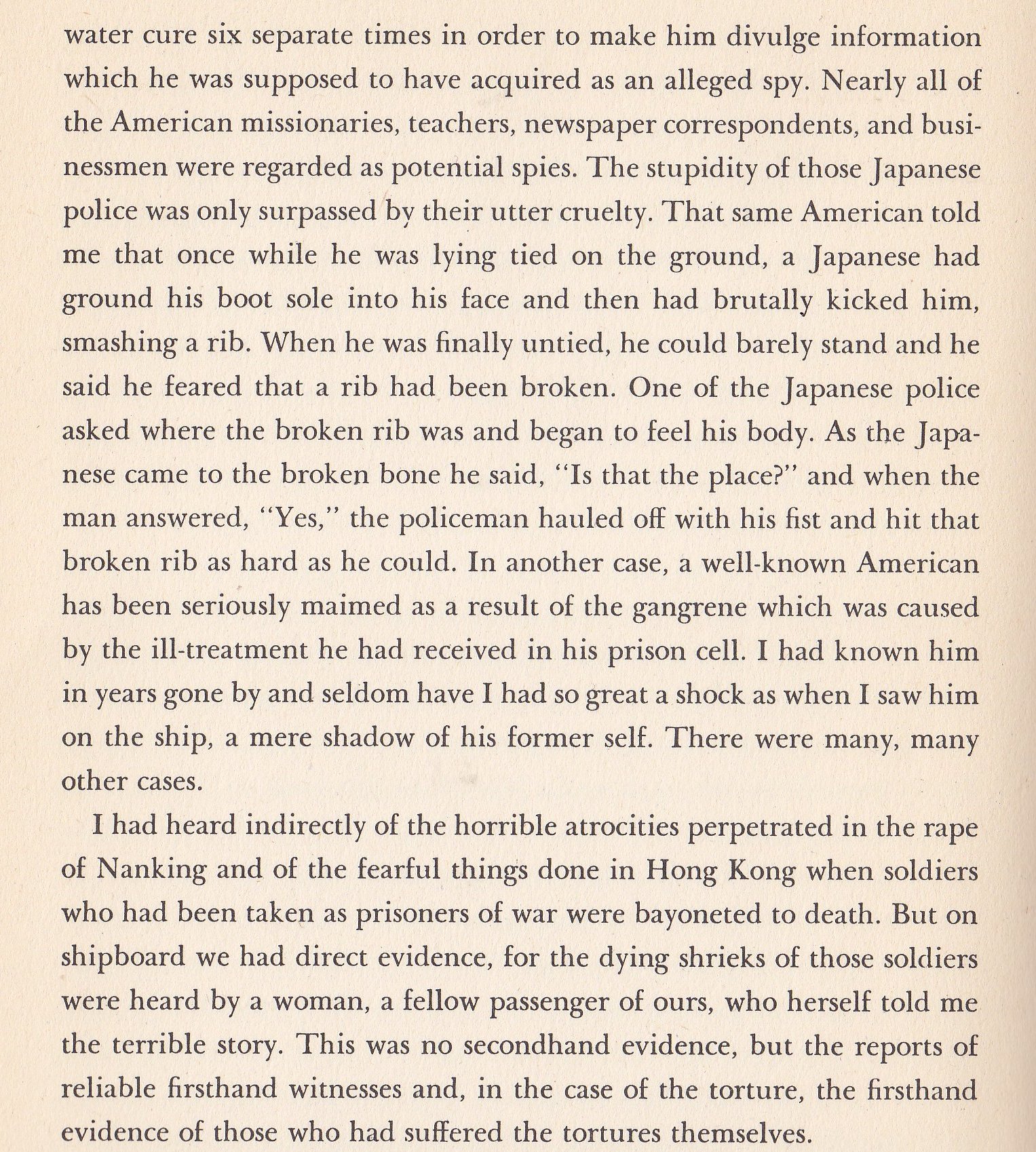 He writes about how the Japanese tortured Americans that were in Japan when the war began. He also refers to the Rape of Nanking.