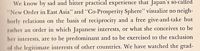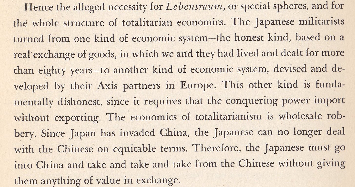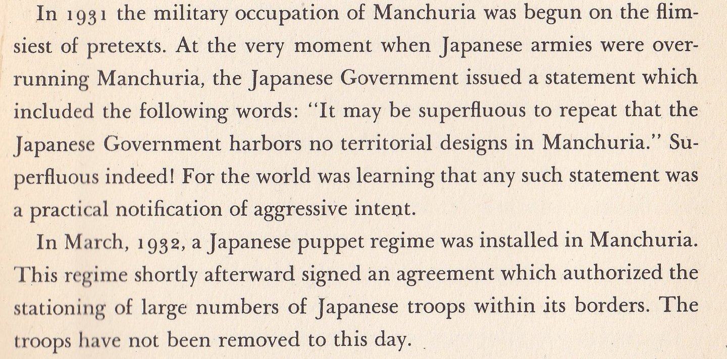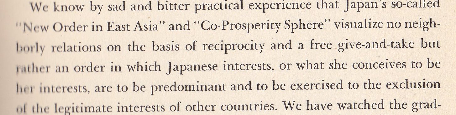 He mentions the co-prosperity sphere and refers to the 'legitimate' interests of other countries. This is one thing I sort of wonder about. Why would other countries, as such, have legitimate interests in another country? It's not the country that has the interest; it's almost always economic cartels and corporations that have their own best interests at stake and not the interests of either country. 'Greed over all' is more their theme.
