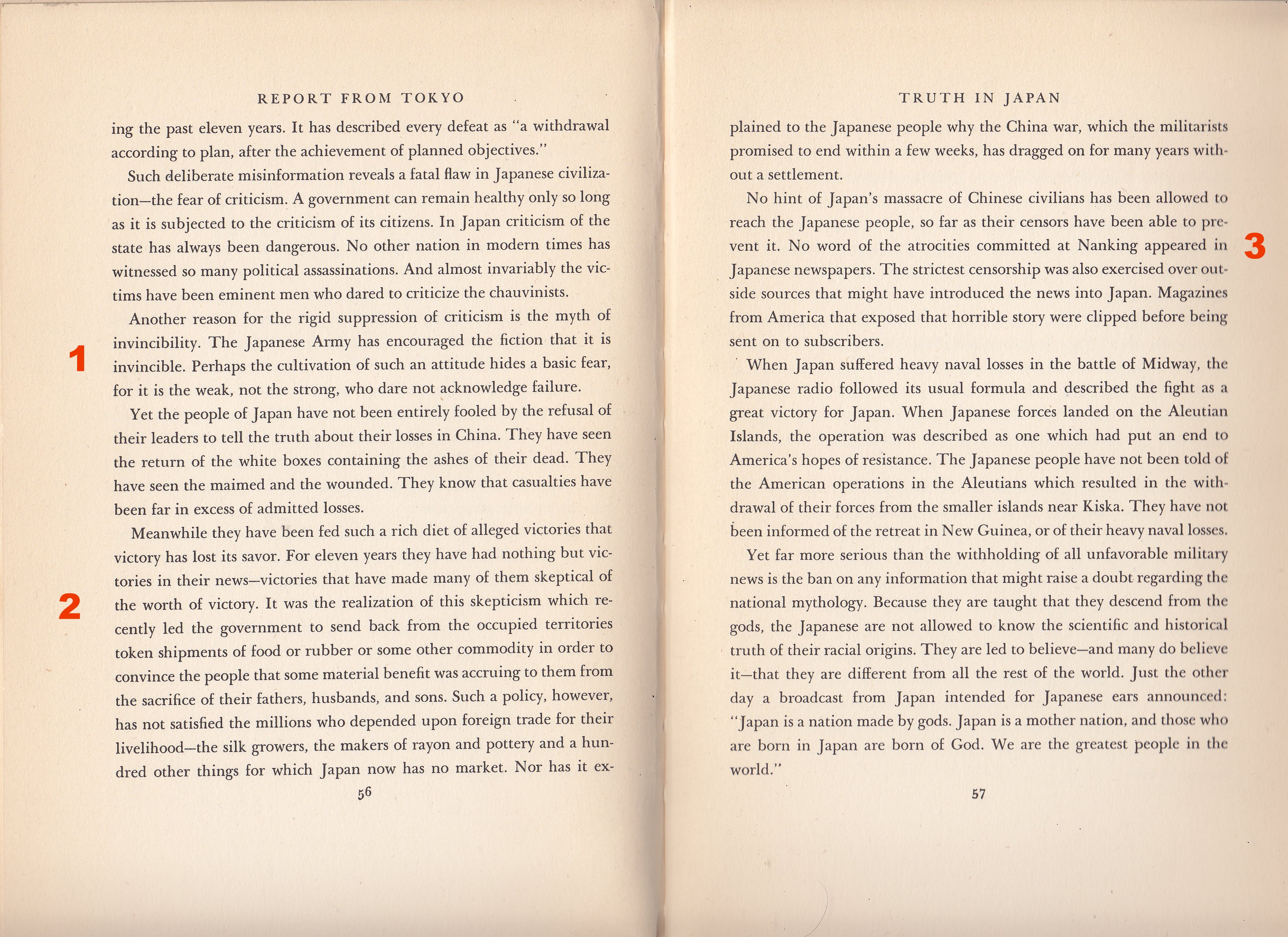 2. The Japanese were told of the victories of their military, but once the military started losing, they were either not told at all, or so much spin was put on the losses that they still appeared to be victories.