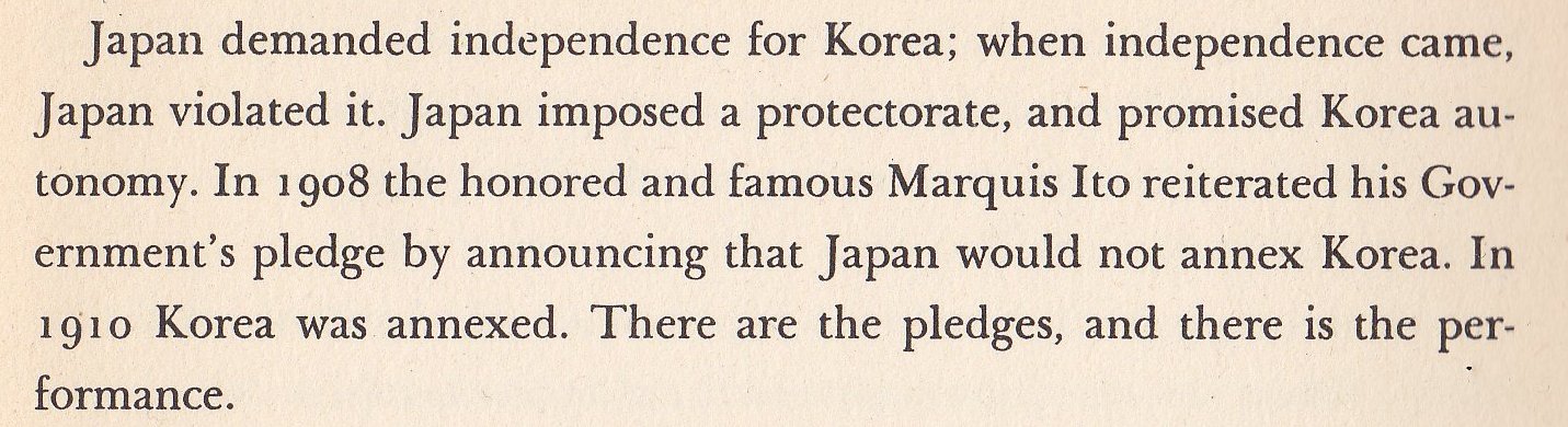 The book talks about various pledges that Japan had made and broken, citing Korea as one of them.