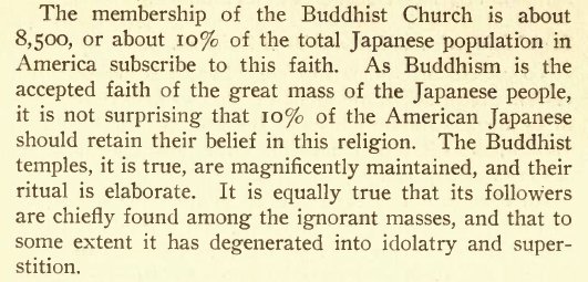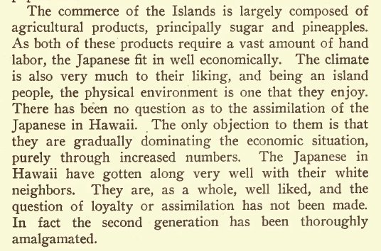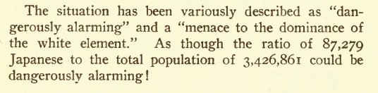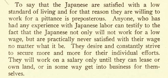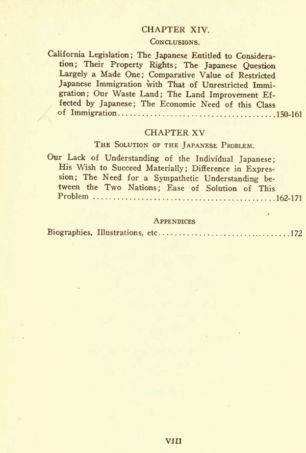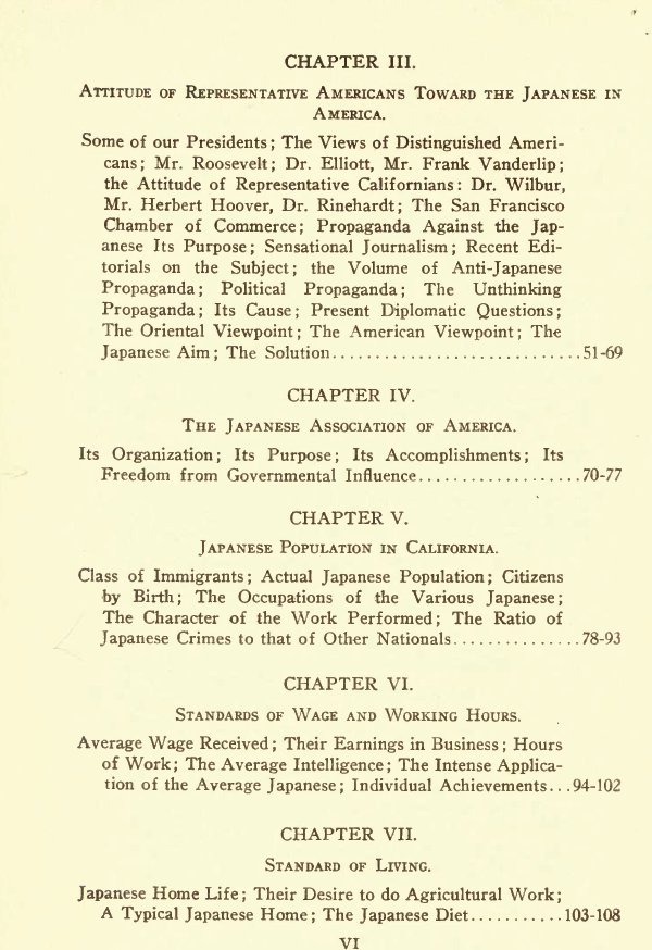The next chapter is about the population of Japanese in California. The chapter then goes into picture brides, the immigrant birth rate, and the jobs the Japanese held. The chapter after that goes into the wages the Japanese received. Both chapters have numerous tables of statistical information.