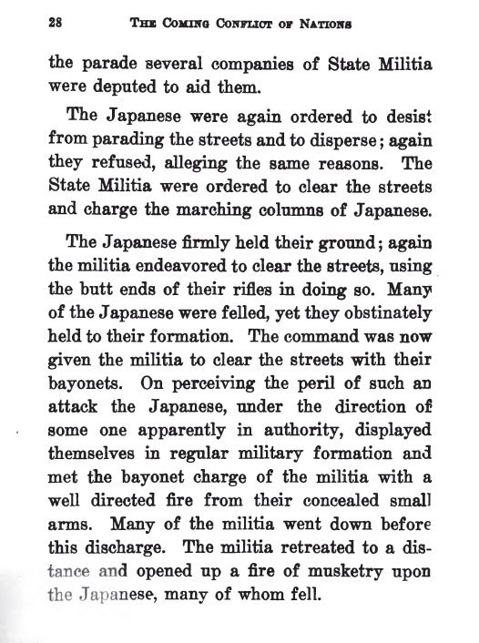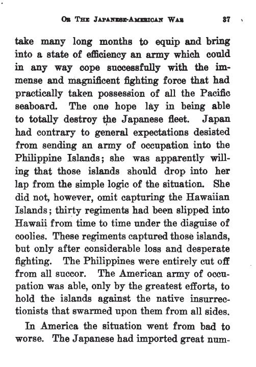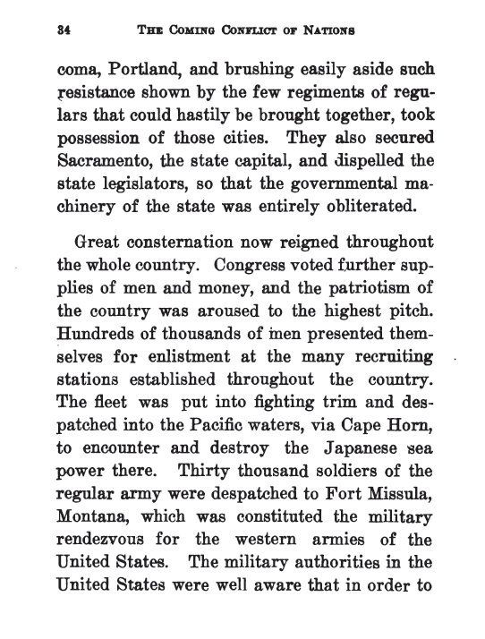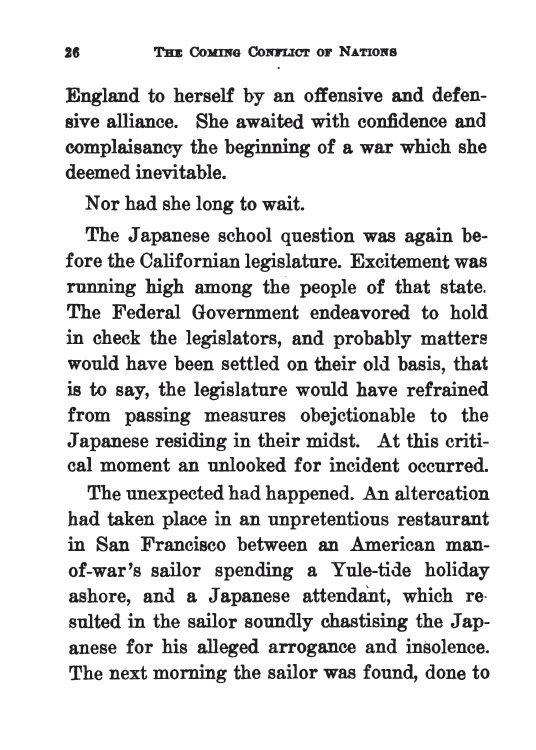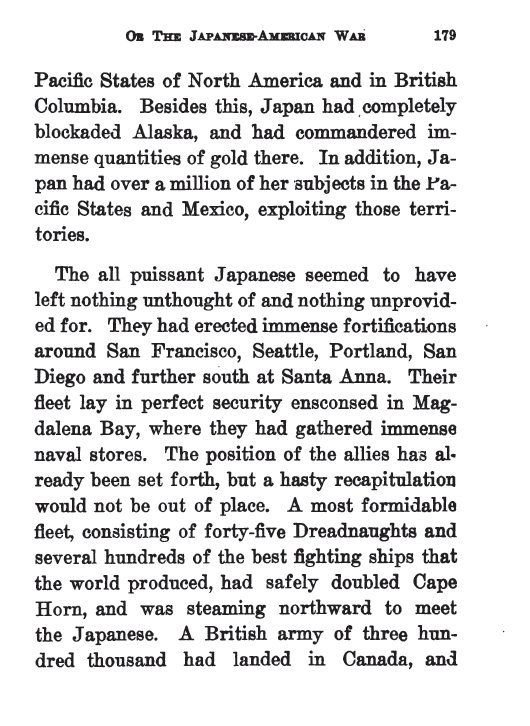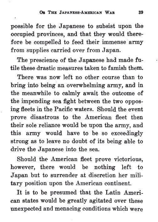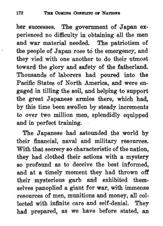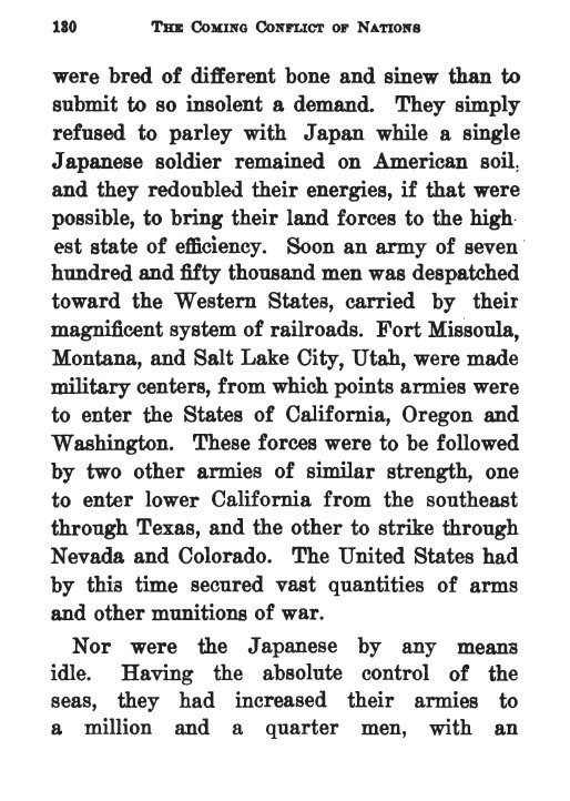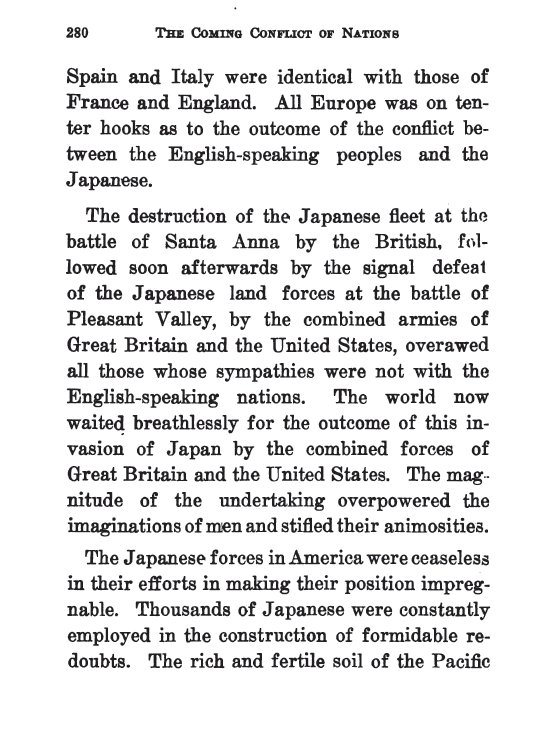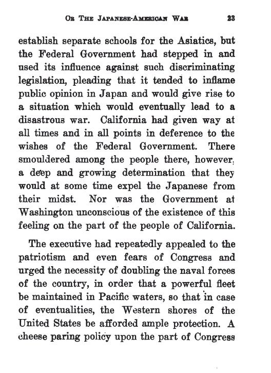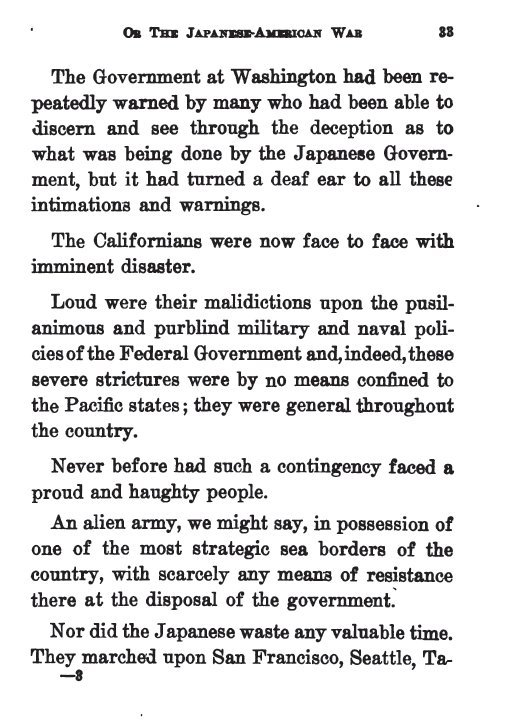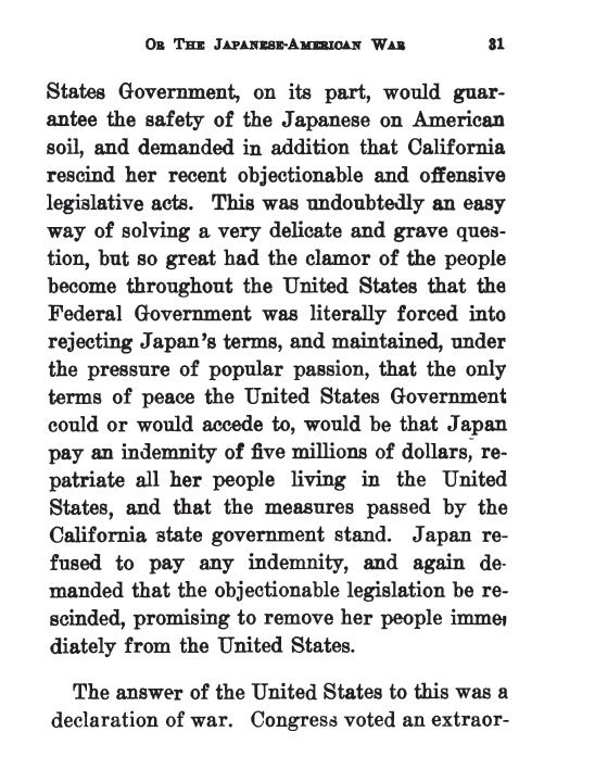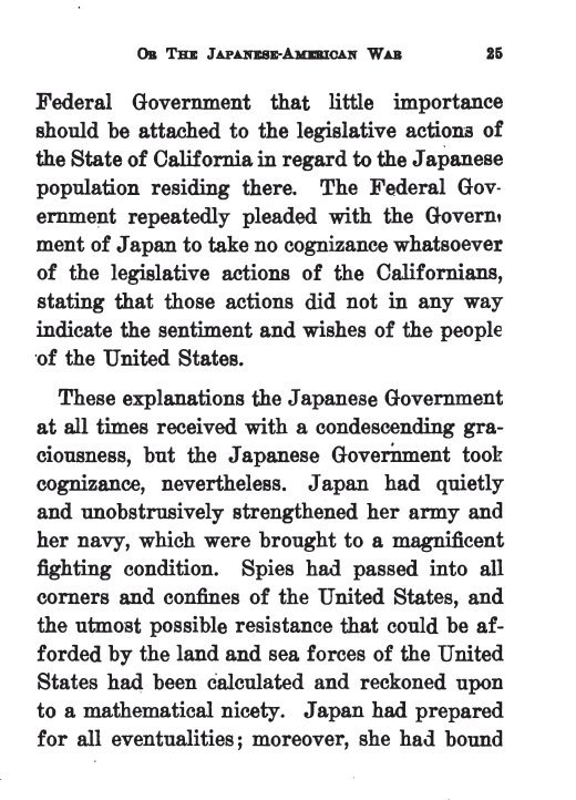 Similar to what really happened: California resented the Japanese immigrants. Separate schools for the Asiatics. Neither the navy nor the army of the U. S. is strong enough to defend the west coast properly. Japan had built up her military forces.