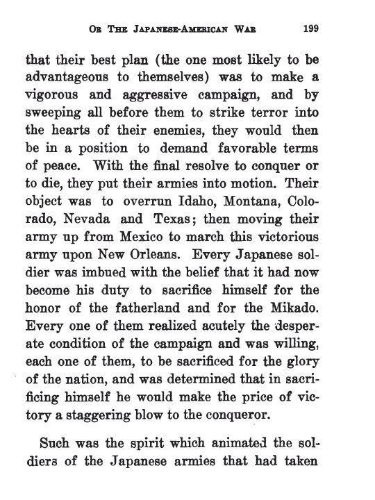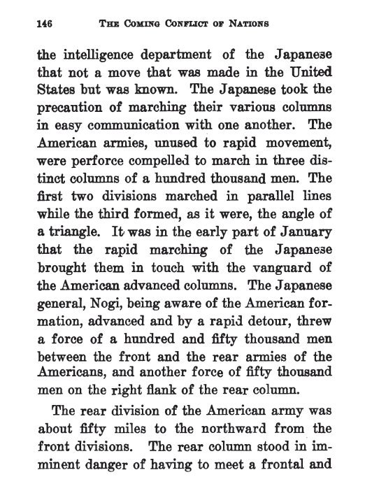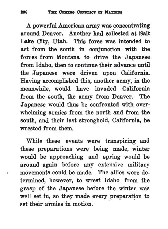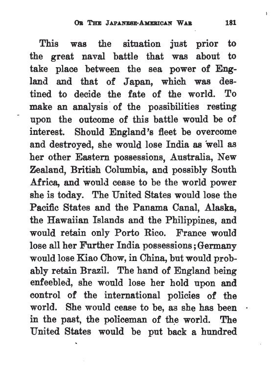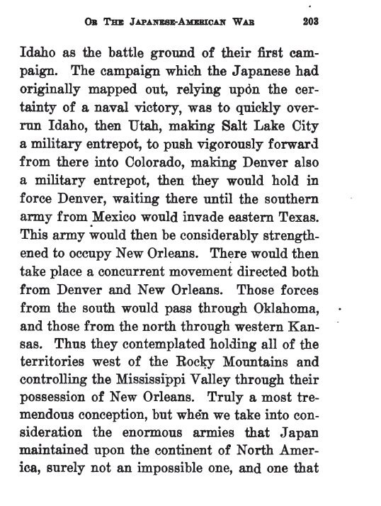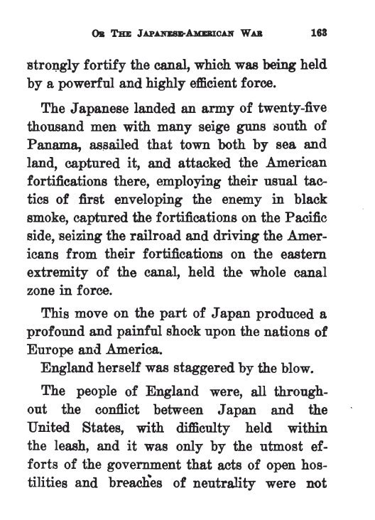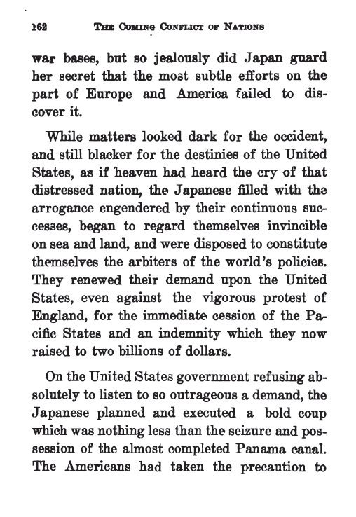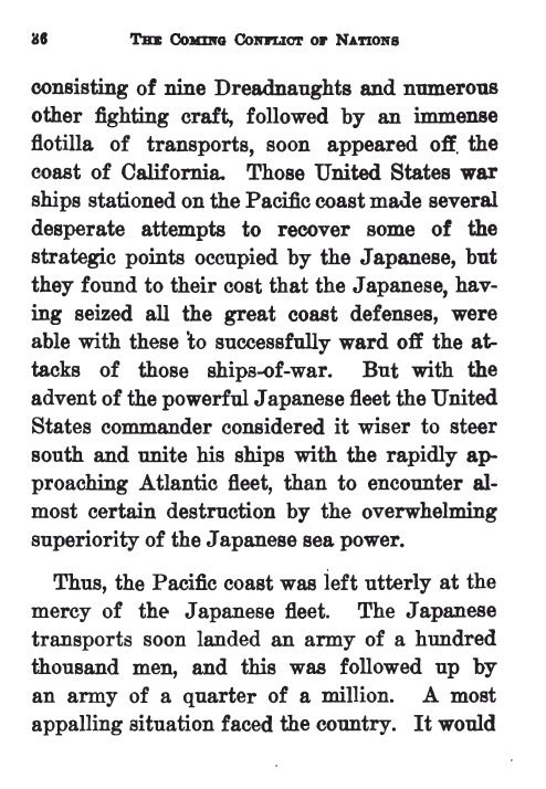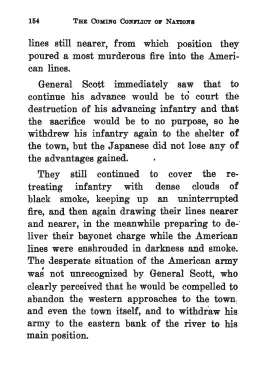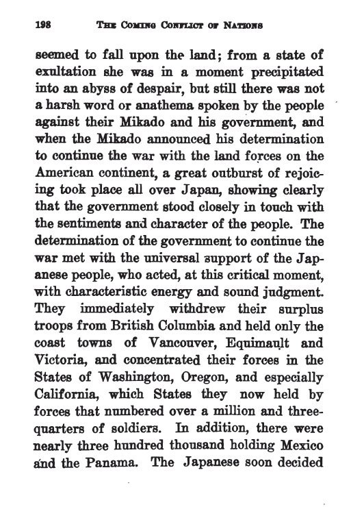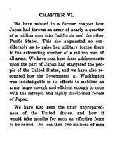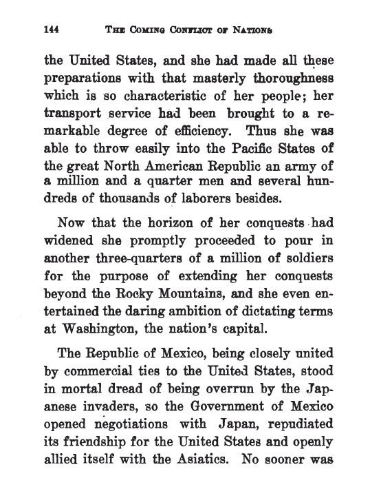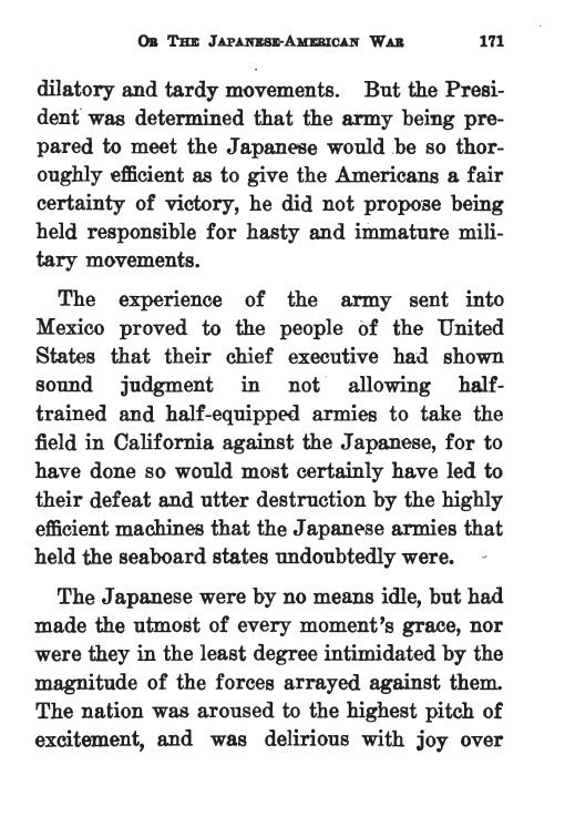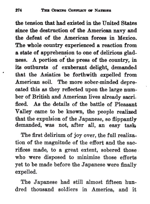 Similar to what really happened: California resented the Japanese immigrants. Separate schools for the Asiatics. Neither the navy nor the army of the U. S. is strong enough to defend the west coast properly. Japan had built up her military forces.