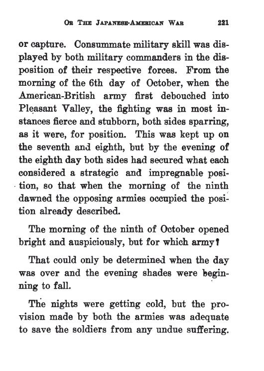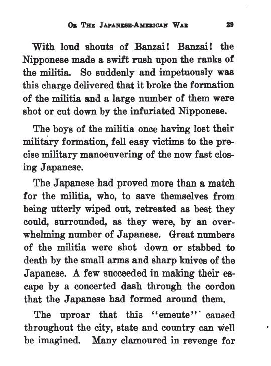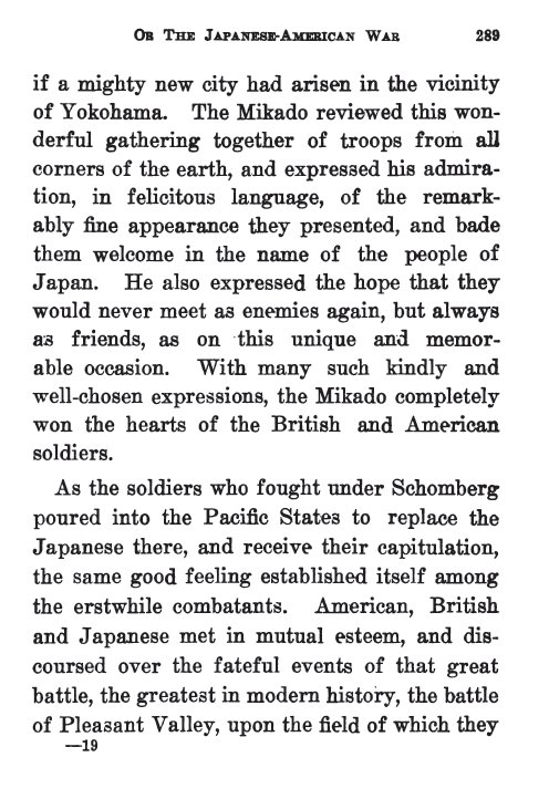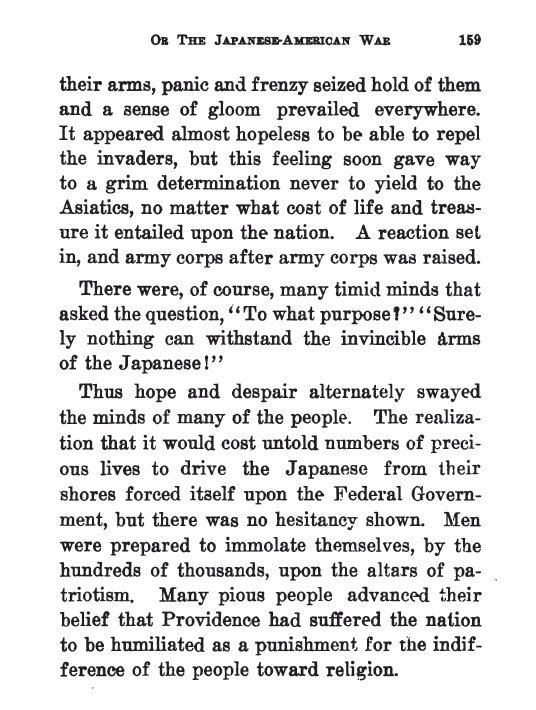 There's a riot, and the Japanese soundly defeat the militia sent against them which causes an uproar across the nation. Japan offers to withdraw its immigrants but only under certain conditions. Negotiations fail, and the U.S. declares war against Japan.