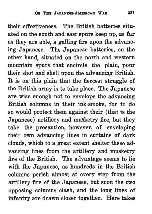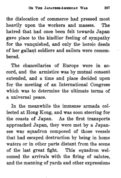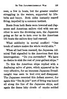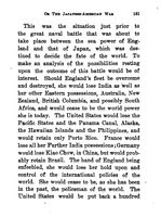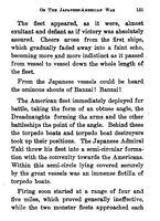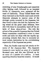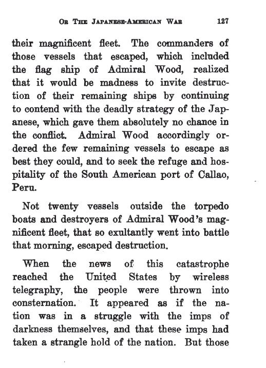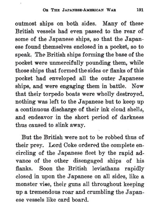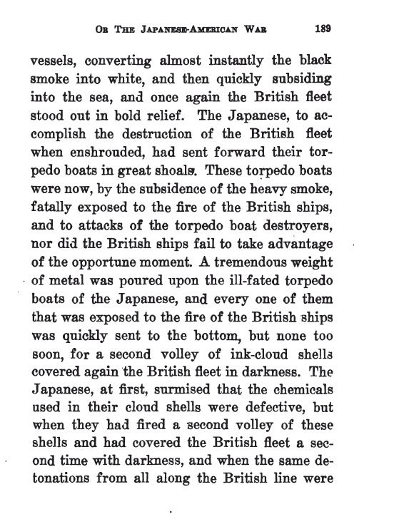 The two battle fleets converge on each other. They converge near Panama. The Japanese fleet has some kind of odd weapon that fires explosives under a dark cloud and they destroy the American fleet. Japan demands the U.S. cede the Pacific states and pay Japan money.