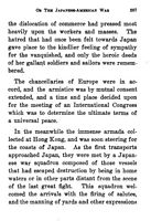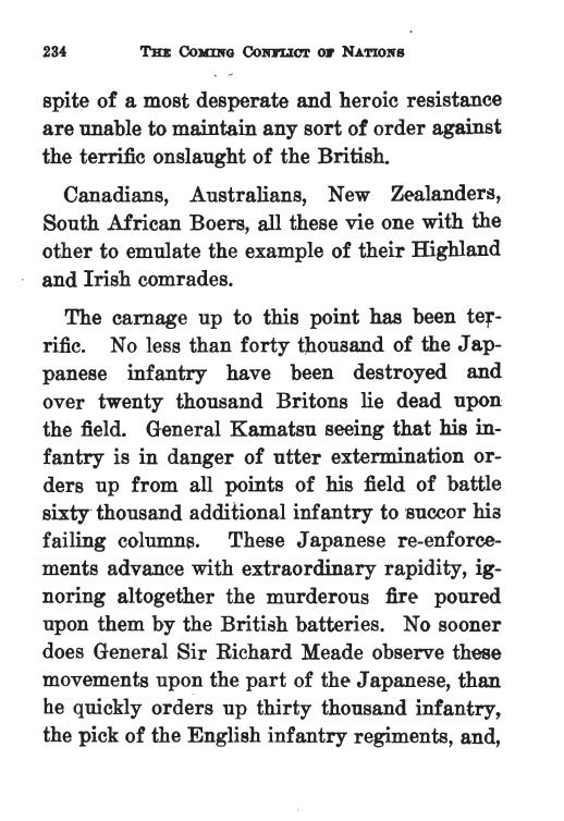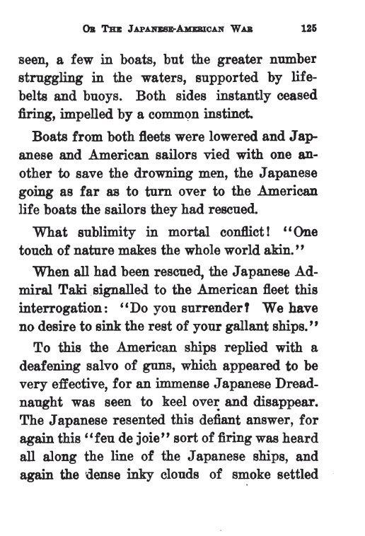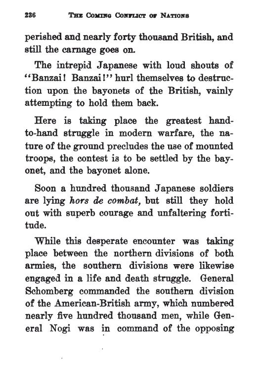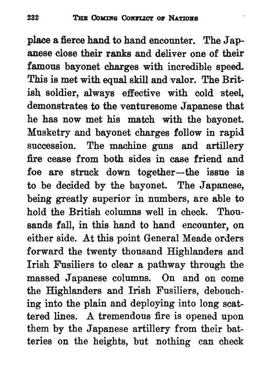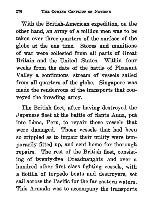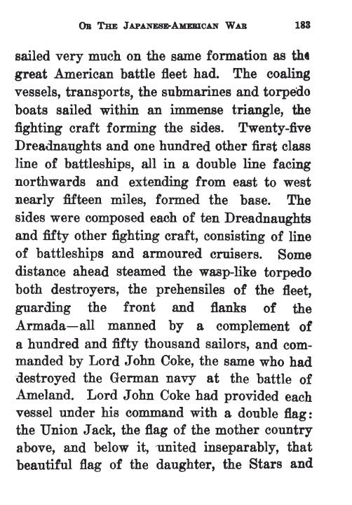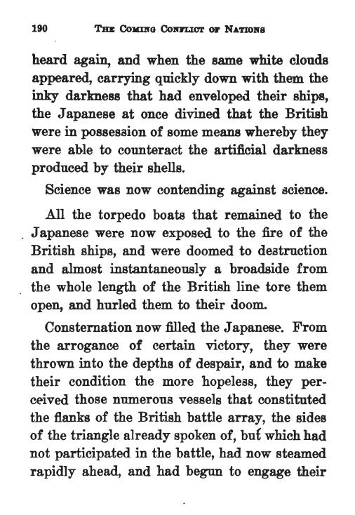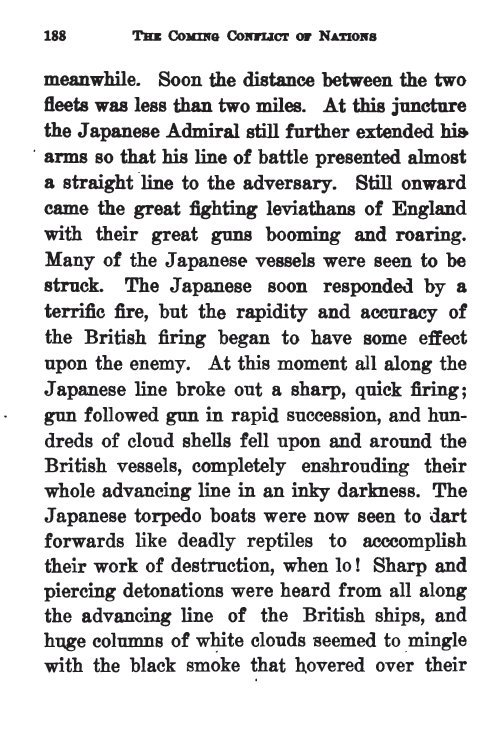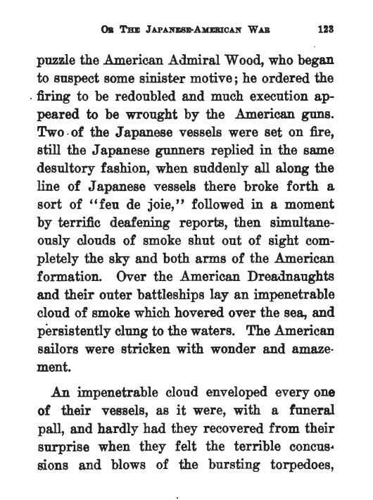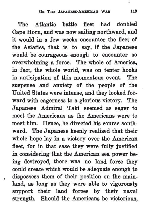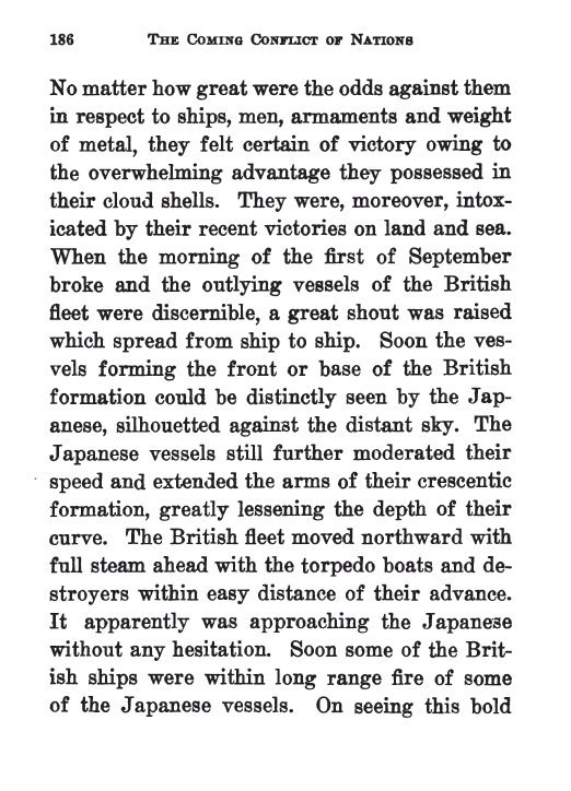 Different from what really happened: The book is a product of its times; it envisions the fleet battle as a confrontation of battleships. There are no aircraft carriers involved at all. There are also no superbattleships like the Yamato. Also missing from the battle are submarines. I can understand why the author had no aircraft carriers involved, but I am a little surprised about the total lack of submarines.