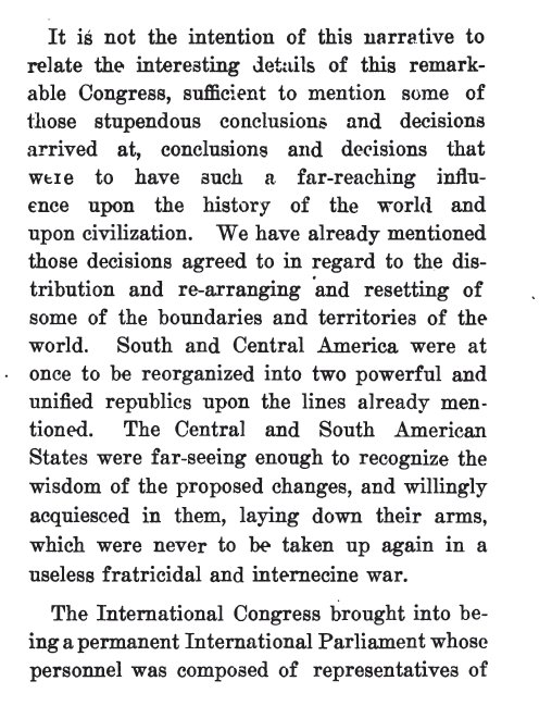 A confederation of English-speaking countries is established. A lot of the Latin American nations are at war with each other. The Central American nations are confederated. The South American nations are done away with and reorganized to be one country with the former countries being states like in the United States.