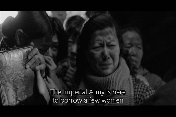 Women are taken from the Safety Zone.100 of the women they gather will be used for the comfort stations. If this isn't done the Japanese will destroy the Safety Zone. We also see that the women who are chosen are treated like dirt.