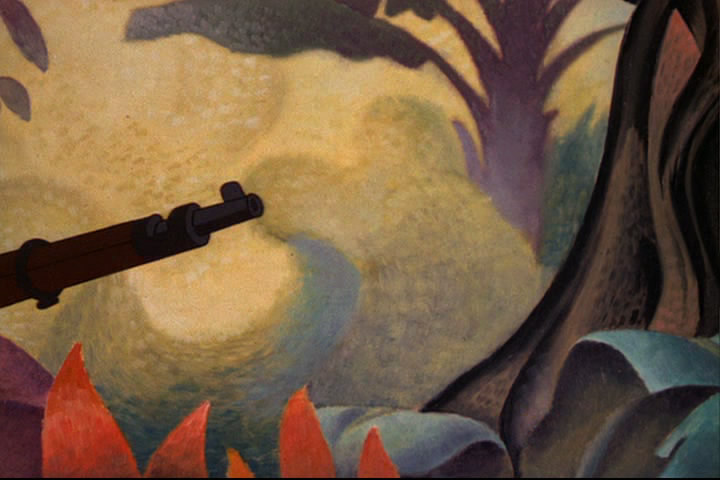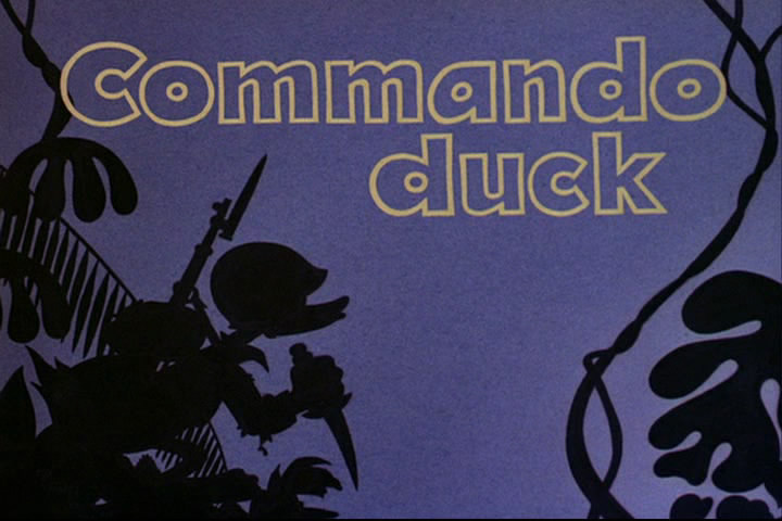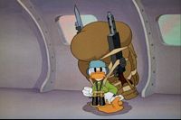 In this 1944 cartoon Donald is dropped into a jungle somewhere and his task is to get to an enemy airfield and “surround it” and “wipe them out”, although there is only him on the mission. It's a Japanese-held island, and this is where we get more of the stereotypes of the Japanese.