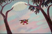 Donald jumps and ends up caught in some trees. He falls to earth and then inflates a rubber boat to go down the river.