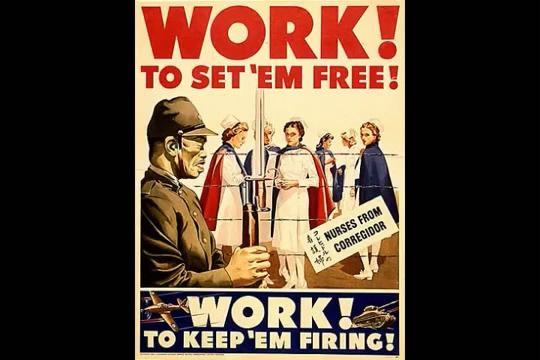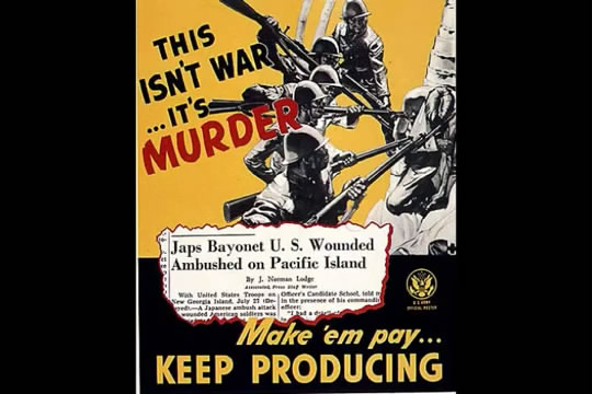 This part is on enemy atrocities, breaking the rules of warfare. Propaganda depicted the enemy as evil and with goals that threatened our way of life.