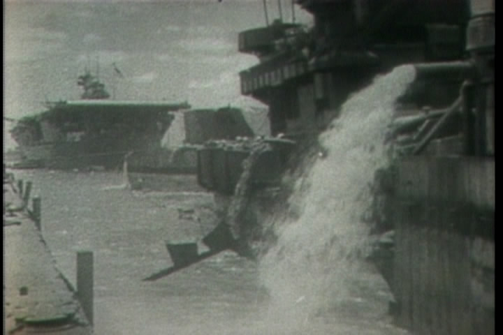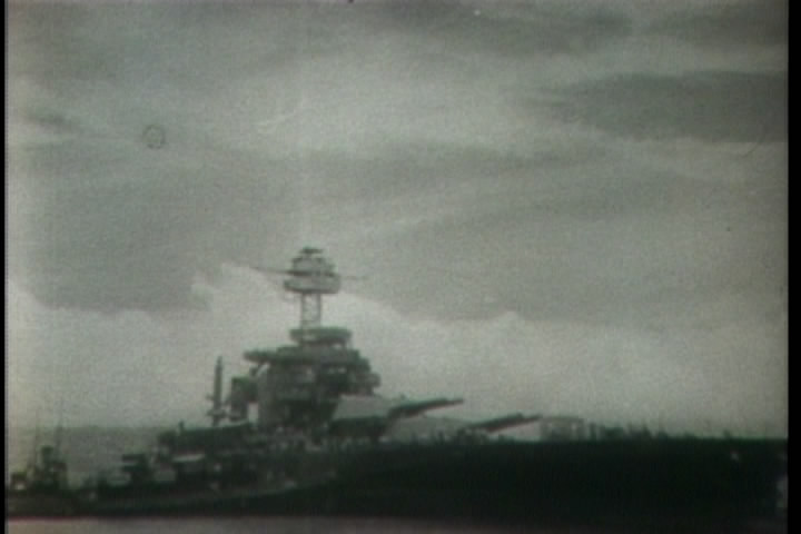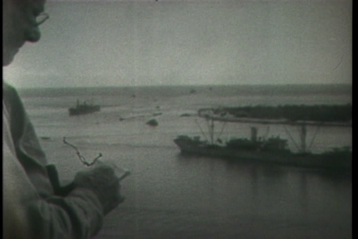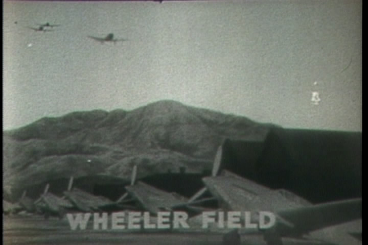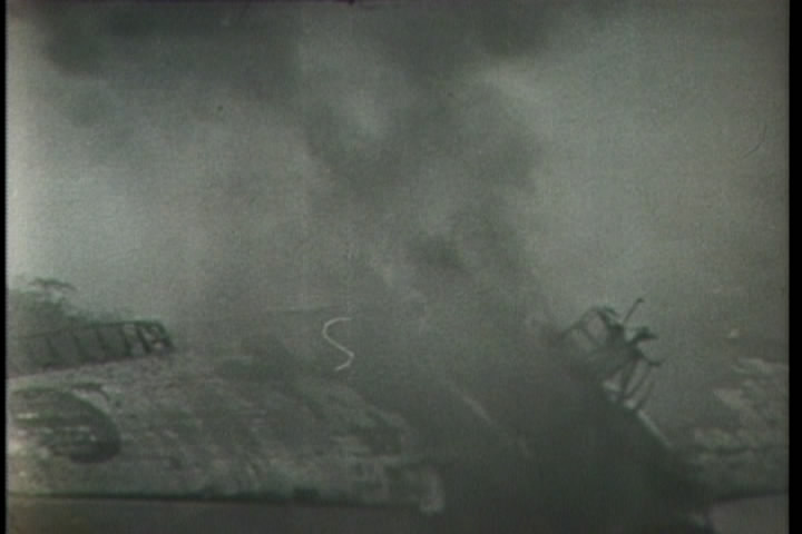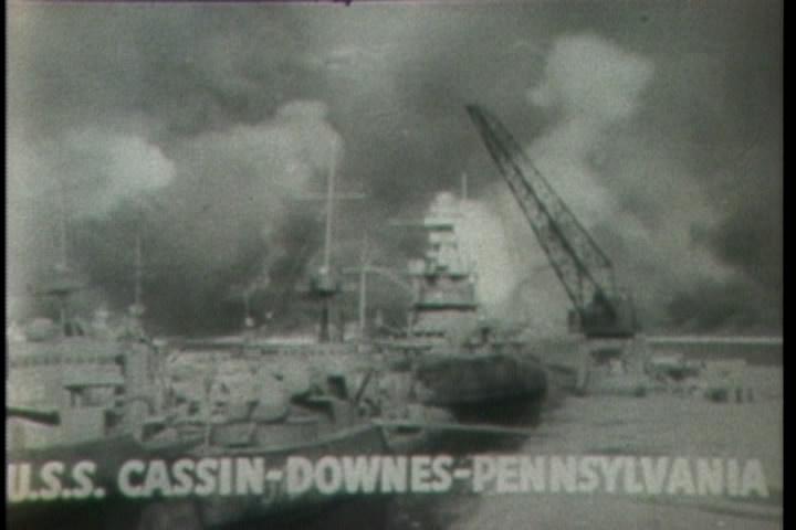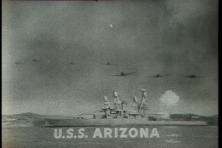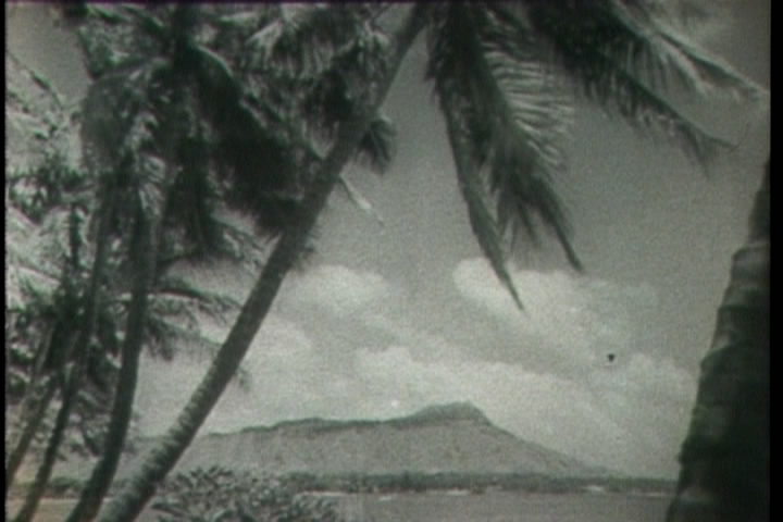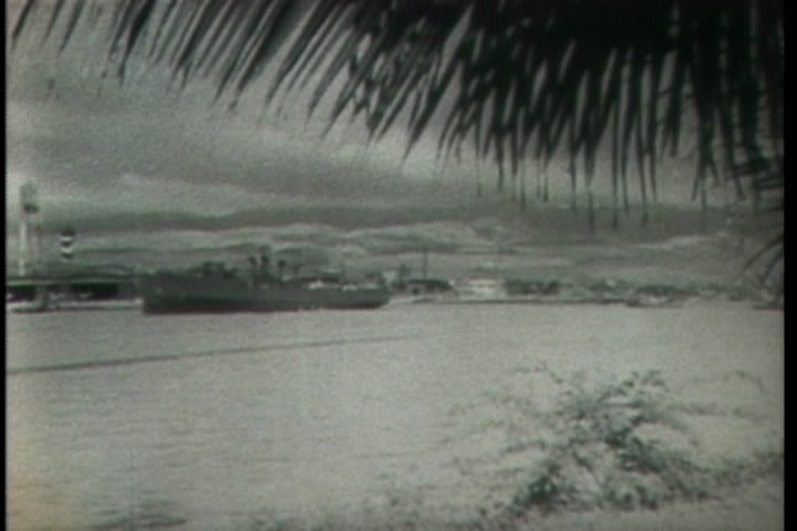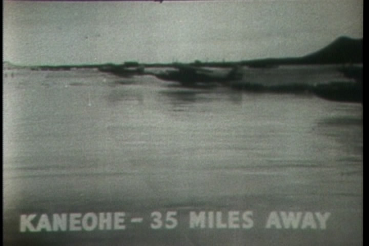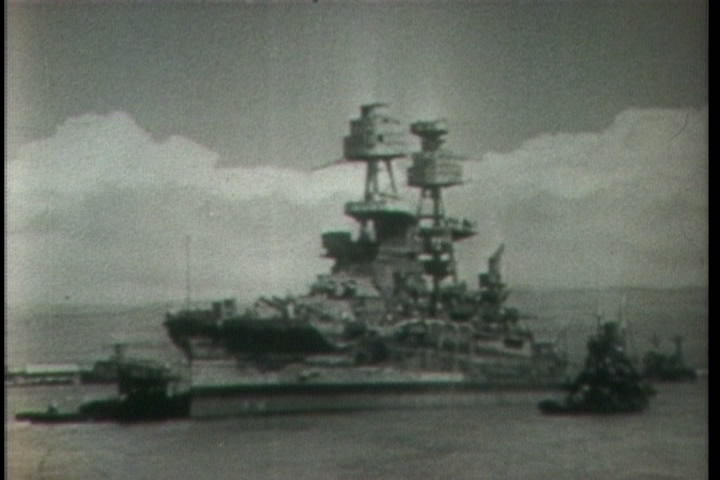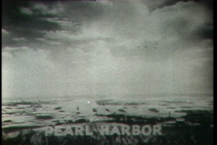 The film then talks about the ships at Pearl Harbor that lay at anchor. Notice the Japanese (probably Issei) in the foreground; this, plus the earlier mention of a the possibility of an “uprising” on the island is, I think, sort of a slap against the faces of the Japanese Americans living in Hawaii.