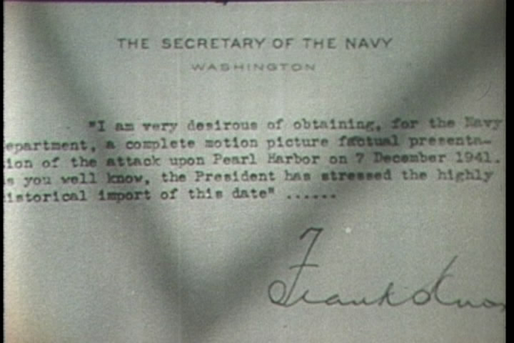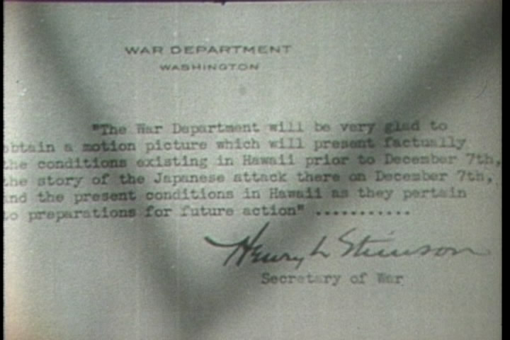 A letter from the Secretary of War asking for a film about the events that took place at Pearl Harbor.