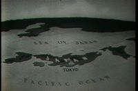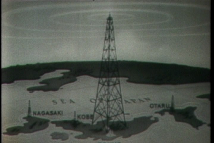 The map of Japan and the radio tower is representing a speech by Tojo against the United States.