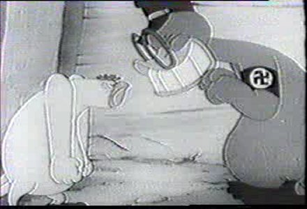 "Give ‘em one for Pearl Harbor" is heard in the background as the Gestapo ducks get beat up and thrown into a trash can.