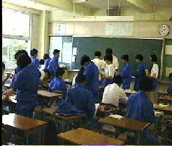 This is a photo of an average Japanese classroom. I want to point out a few things here. The Japanese classrooms are not wonderfully equipped compared to American classrooms. They don't have the most modern furniture in the world; notice the rather old-fashioned desks and the traditional but small bulletin board. From what I have read in various sources the typical Japanese classrooms are no better physically than American average classrooms. So, then, Japanese success in education is not due to their having wonderful rooms.