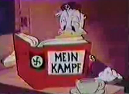 At one point a starving Donald sprays a perfume essence of bacon and eggs in his mouth. He cuts off a piece of bread as hard as a board. Later a rifle and bayonet enter the frame and Mein Kampf is put in front of him with the soldier saying “Here, improve the mind.”