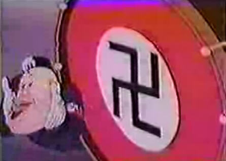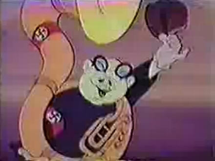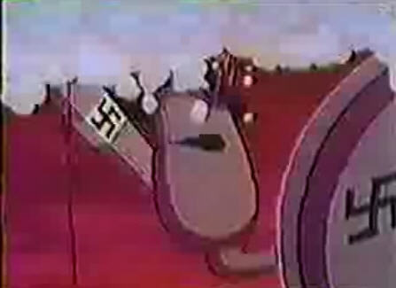 “Now, through the kindness of der Fuehrer comes the vacation with pay.” A large wall hanging is then displayed behind Donald.