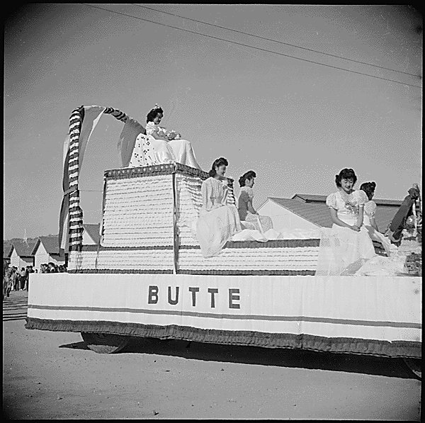 Pretty evacuee girls rode in this float in the Harvest Festival Parade which was held at this center on Thanksgiving day. 11/26/42 |