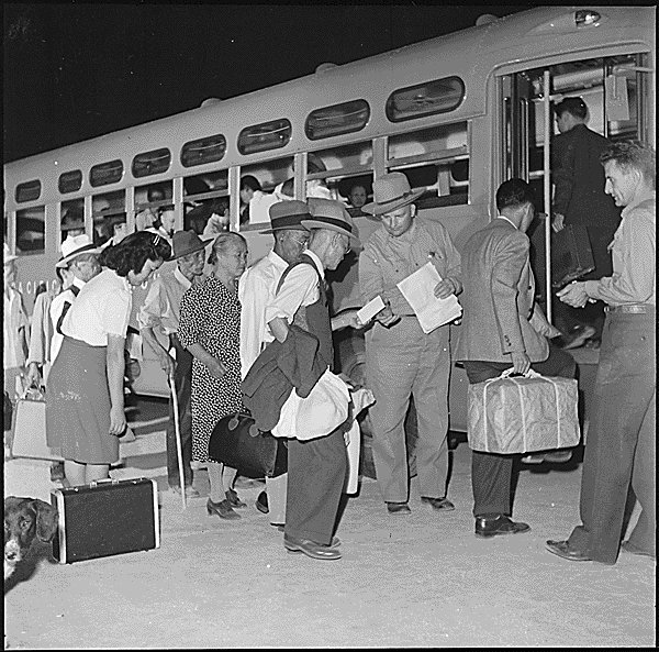 Evacuees returning to their former homes in California by Greyhound bus. On September 15, two weeks before the Canal Camp at Rivers, Arizona, was to close, only 635 people remained and 370 of these had bus or train reservations for the following week (the Canal Camp once had more than 5,000 residents). Most of the people are going out by special Greyhound buses. Their property, crated for freight shipment, is picked up at their homes and stored in project warehouses until it is loaded on the heavy trucking vans. Before the relocators leave the Center they secure their travel vouchers and their ration books from the Leave Office and get their special Relocation Grant from the Agent Cashier. Farm machinery, once used in the production of vegetables and melons for Gila and other centers, now is assembled ready to be moved from the Center. All the livestock is gone and buildings and fences are being torn down. |