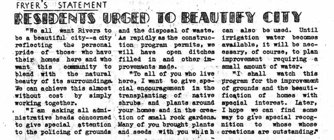 Page 1: A head has been picked for the colony labor board; a report on results of picking cotton; the camp director wants residents to improve the looks of their residences by planting things; a meeting of the administrative staff over the cotton picking.
