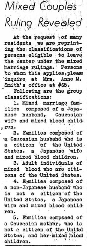 Page 1: Employment policies announced by WRA; temporary government organized; certain blocks that were going to be moved to make way for schools will not be moved; new arrivals at camp; anyone leaving camp for work outside has to file a change of address card with the F.B.I.; visitor's permit process has been started.