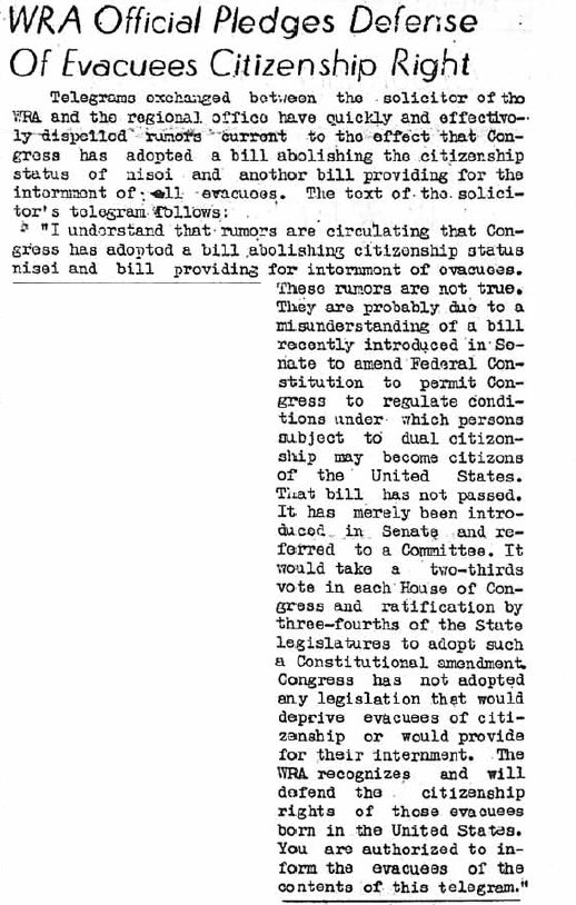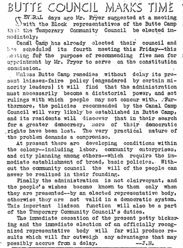 Page 1: Small family rooms assured; 53 candidates for block representative offices; reversing a previous ruling, Nisei soldiers can visit camps in the Military Zones; some people leaving, some arriving; a photographer will take pictures the next day; club sponsor forum; central block manager of Butte is named; constitution committee check progress report.