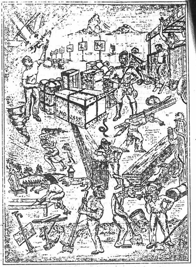 Page 7: A temporary religious council has been chosen; Christian Church dedication; first boys' club formed; firemen work in shifts; list of church services; lost & found; dance class draws crowd; librarians are needed; souvenir maps available.