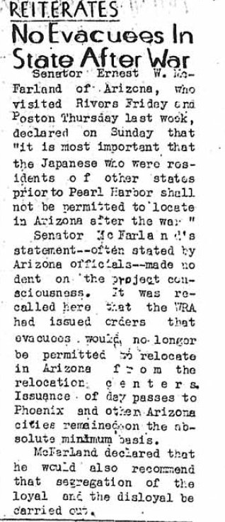 Arizona doesn't want Japanese after war ends.