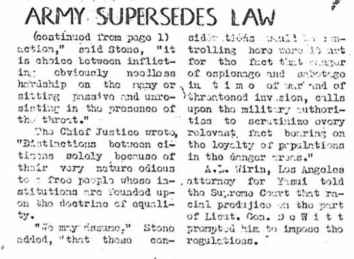 Page 1: Commencement speakers chosen; canceling co-op license declared unconstitutional; resettlement in Arizona stopped; WRA will film exodus, centers; civil service tests planned; civil service; license needed for fishing.