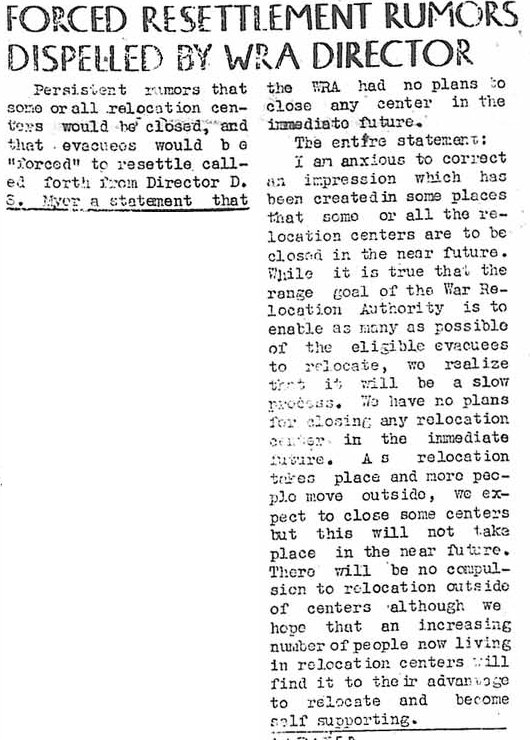 Page 1: Notice net workers; carpenters needed for new schools; WAC recruiters here; Tule Lake described; evacuee property service listed; varied jobs available in Washington, D.C. area.