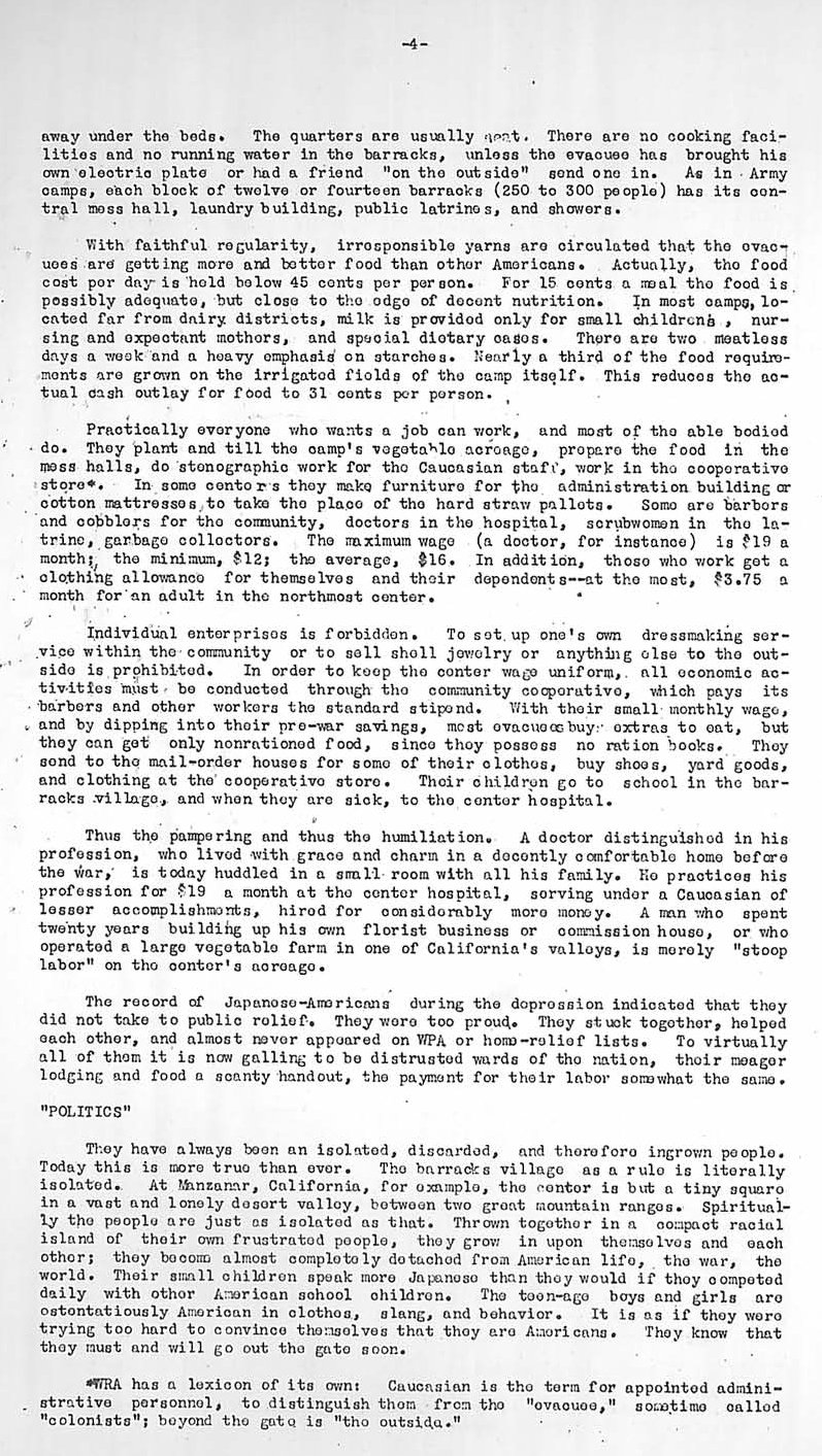 Page 4: Wayside inn created for recuperating patients; check and pick; Nisei addresses college audience; domestic fowls forbidden in camp; fun-by-doing.