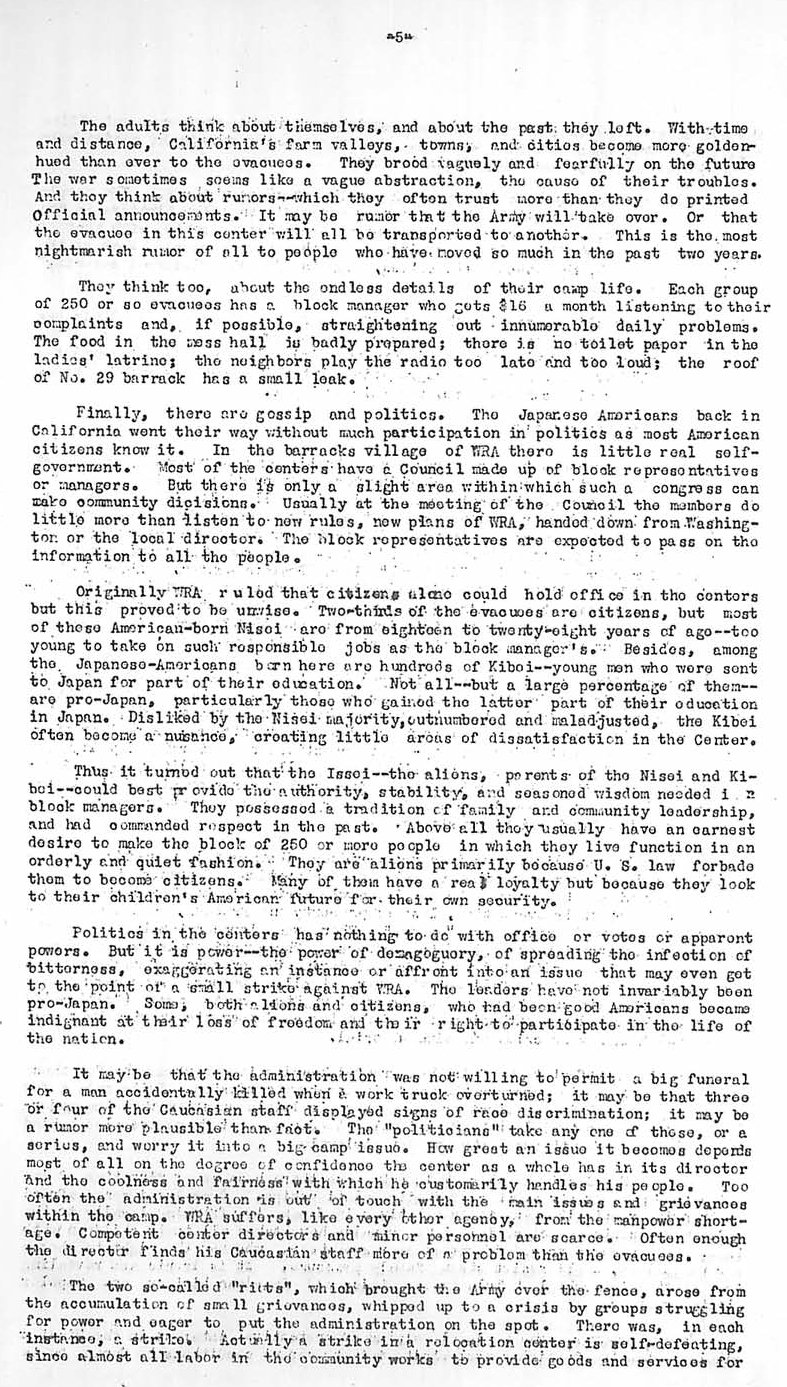 Page 1: Private work ban effective; Ickes accuses LaGuardia of racial discrimination; Nishimura chosen to visit Jerome; Red Cross message to Japan limited; leave and employment regulations discussed; mess schedule undergoes change.