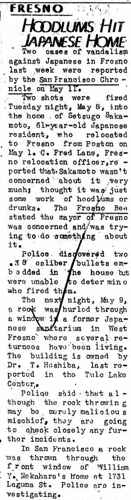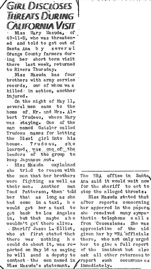 Page 1: Farm cuts employees to close camp; additions to Army list given; Private Yeto killed, two others injured; Rivers honors dead soldiers; WRA staff gets ready to leave; those castor plants.