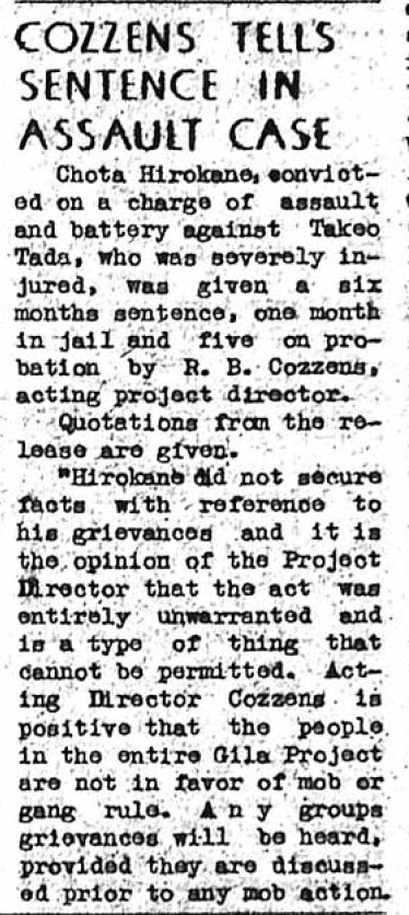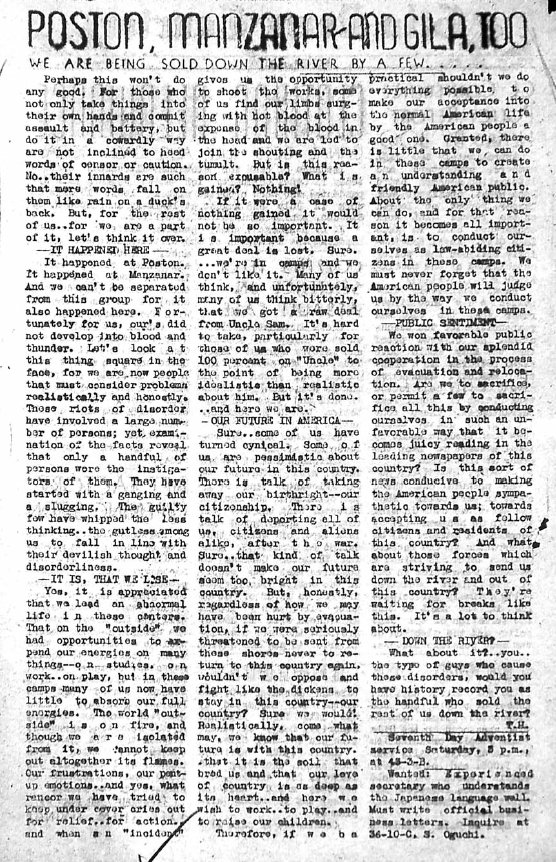 Page 1: Vegetables preponderant in wartime food ration; JACL membership drive to begin; colony over-run by Yamamotos; Uncle Sam pays funeral costs; August clothes allowance soon; class rooms; mother of Maintenance and and Construction Dept. head dies.