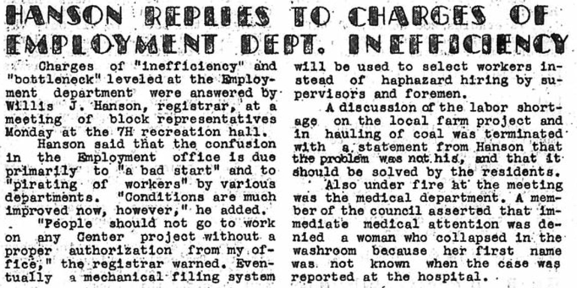 Page 4: A murder was rumored to have taken place at the hospital, but there actually was no murder. The junior high will operate on a full-day schedule. A day nursery will be started. Checks from time at Santa Anita will be available. The Colorado State College of Education has offered to hold three college-level classes at the center if there is enough interest. There have been no major crimes in the camp. (This was probably run on the same page as the murder rumor on purpose.)