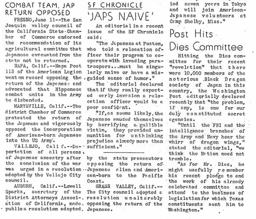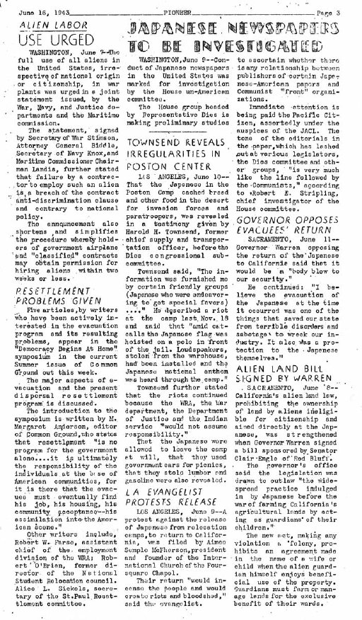 Page 3: Commonweal boosts resettlement program; may allow return to Pacific Coast; 'Japs clean, well behaved'; 'Times' pictures Nisei soldiers; President would preserve rights.