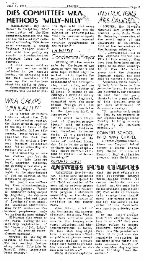 Page 1: Unemployment pay refused; movies; Lil' Neebo to appear weekly; short-wave sets banned by WRA; administrators residing on project listed; deadline set for licenses; questionnaires to be issued; Finch lauds combat unit; jobs found for NYA enrollees.
