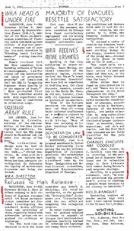 Page 8: Poston labor investigated by Dies; first aid for snake bites; transfers; job opportunities; evacuees reside on center farm; Capt. Karpen to speak to seniors.