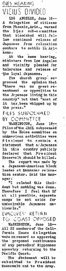 Page 6: Amache schools lose teachers; senior high schedule ready; summer school instrumental music program announced; registration hours given; Rev. Sakauye is guest speaker; job opportunities; six more leave for Chicago hostel.