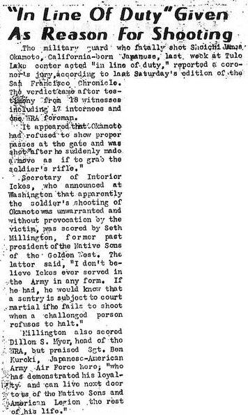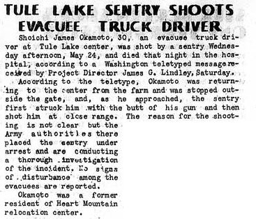 Page 1: 1883 muzzle-loading rifle discovered; Tule Lake bounds reach California safely Sunday; production goal impossible without more help; farm project declared emergency operation; Runcorn to accept position in Tule; $450 damages inflicted at 7E mess fire; Cherry wins war bond.
