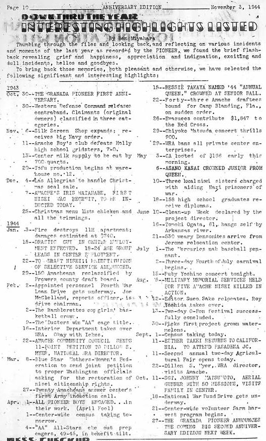 Page 4: High school news; Nissei students total 2500 over 46 states; on funeral pictures; story on Nisei girl evacuee; movies; visiting soldiers; church schedule.