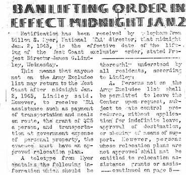 Page 1: Admonition on coast return; wins second place in fire prevention; WRA clarifies visitor status in centers; new coast commandant; silk screen shop sets 3-day exhibition.