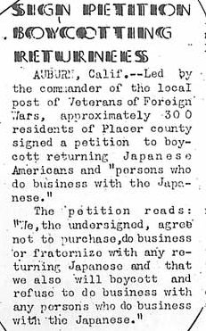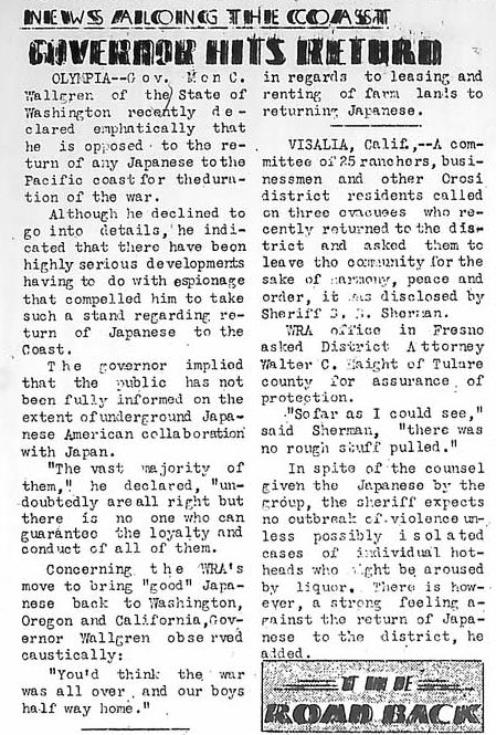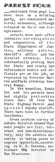 Page 4: Movies; elementary school notes; open Pasadena hostel, requests short visits; supervisors about face; promises protection; visiting soldiers; 5000 renounce citizenship in Tule Lake; church services.