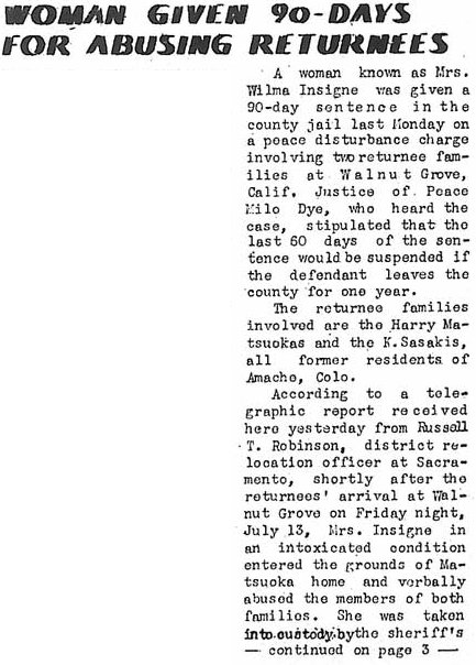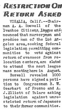 Page 1: To schedule another coach; relocation plan by Sept. 1 imperative; 140 Amacheans board three cars for California return; evacuees in 'hardship' cases may build homes; 9L mess closing stayed two weeks; Blue Stars will honor inductees.