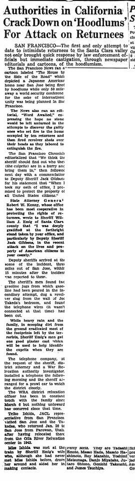 Page 8: 6,375,818 pounds of crops produced here; From the Nation's Press; West Coast 'returnees' report kindly treatment; 95,000 of Japanese ancestry approved to return to homes; Issei woman gets son's Army award; Iwo Vet won't go to coast; family of 9 attacked by night raiders (article was written on so I'm not reproducing it).
