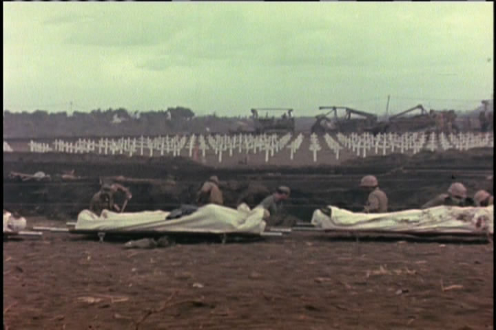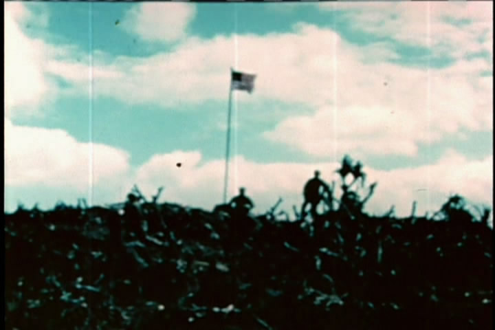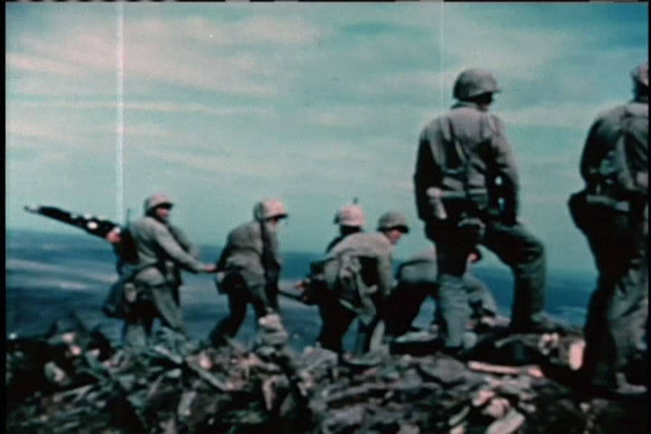 One-by-one the flag raisers are killed in battle. Then a damaged B-29 lands on the not-totally-complete runway, proving the value of taking the island.