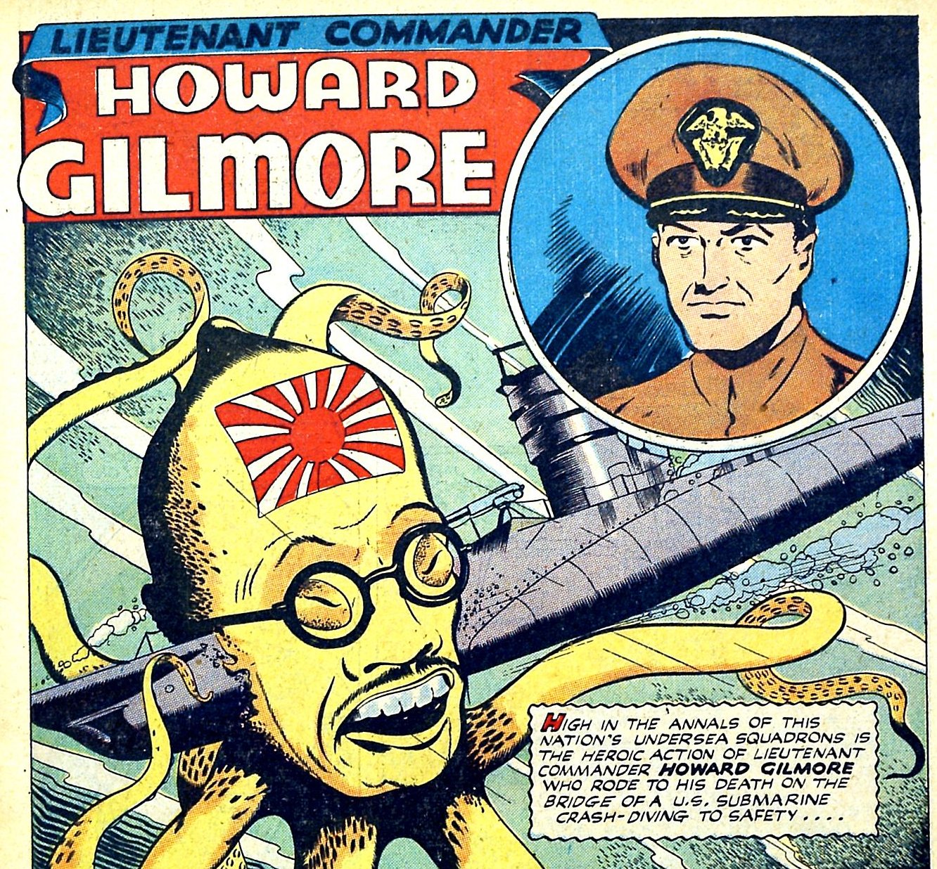 The octopus-monster has the head of Tojo and, of course, the Japanese flag on its forehead. This is a typical anti-Japanese cartoon.