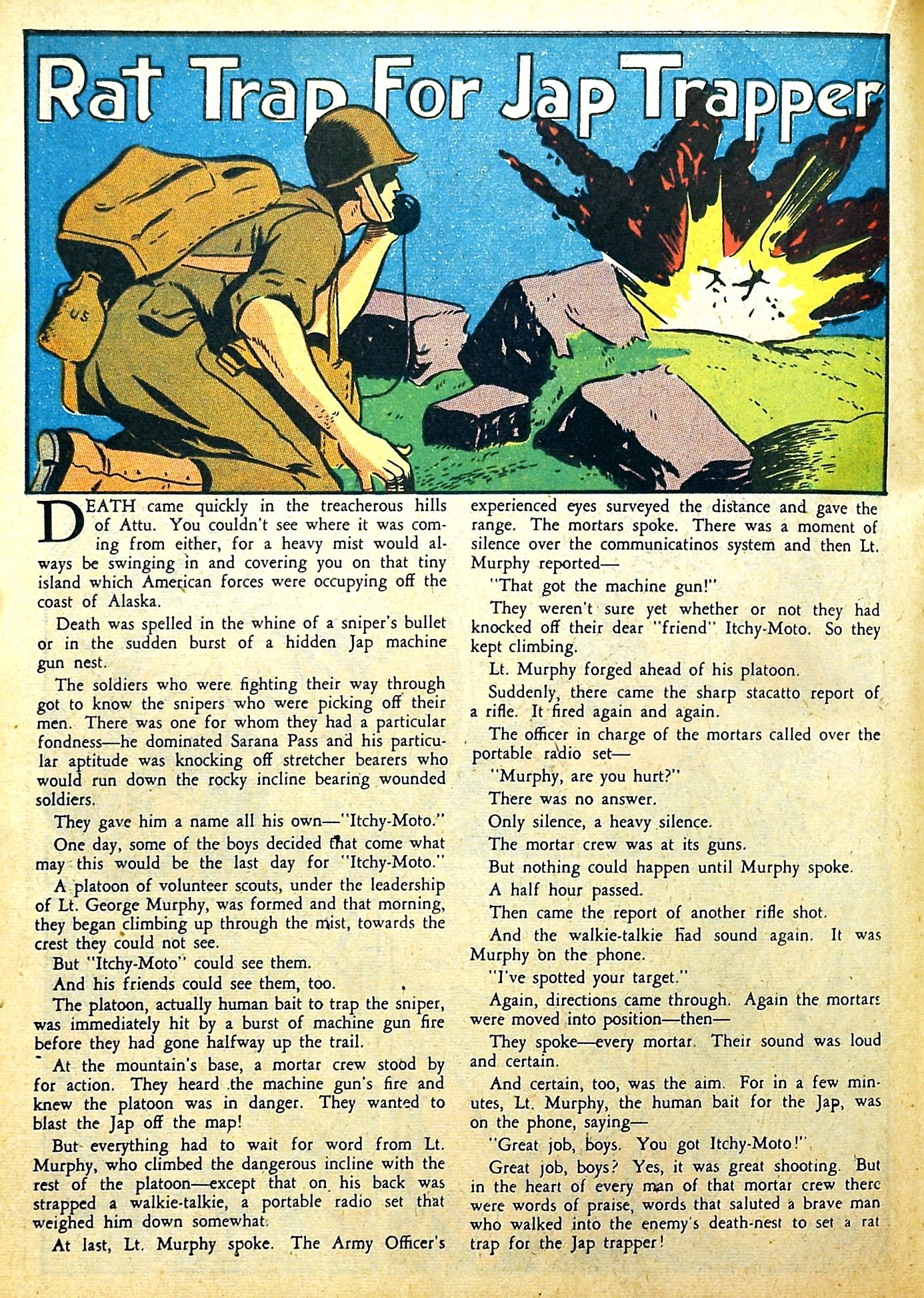 A short story. The story is about one Japanese sniper who picked off men of the Medical Corps who were taking wounded men off the field and how American soldiers finally managed to kill him. The battle was taking place on Attu, one of the islands off Alaska. The Japanese had managed to make a bit of progress but eventually had to abandon the islands. The islands didn't really give either side a practical advantage, especially because the weather tended to be so bad that it made flying planes and piloting boats so bad that neither side could use the islands as a way to attack the other side's home territory.